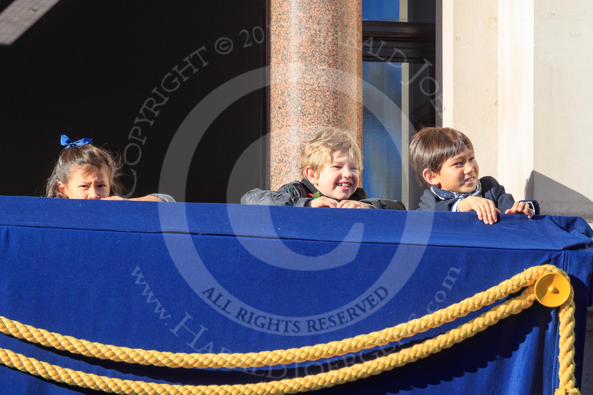 Photo #41 (1811111003271X29584HaraldJoergens) Children on one of the balconies of the Foreign and Commonwealth Office before the Remembrance Sunday Cenotaph Ceremony 2018 at Horse Guards Parade, Westminster, London, 11 November 2018, 10:03.
