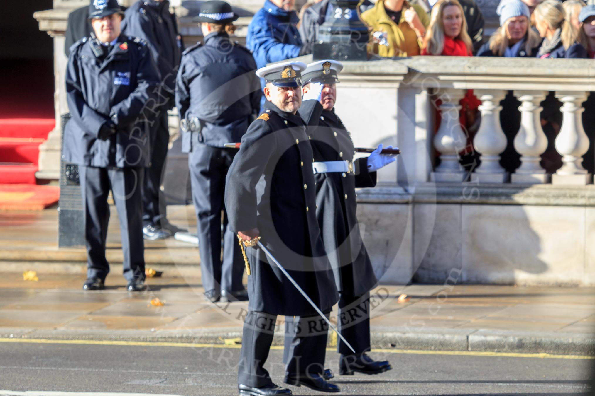 Photo #44 (1811111007141D49823HaraldJoergens) Two Royal Navy officers arriving on Whitehall ahead of their service detachment, before the Remembrance Sunday Cenotaph Ceremony 2018 at Horse Guards Parade, Westminster, London, 11 November 2018, 10:07.