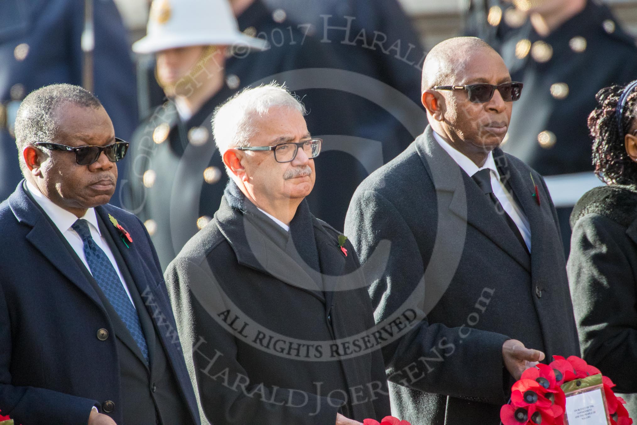 The High Commissioner of Zambia, Muyeba Shichapwa Chikonde, the High Commissioner of Malta, Joesph Cole, and the High Commissioner of Malawi, Kena A. Mphonda, during Remembrance Sunday Cenotaph Ceremony 2018 at Horse Guards Parade, Westminster, London, 11 November 2018, 11:04.