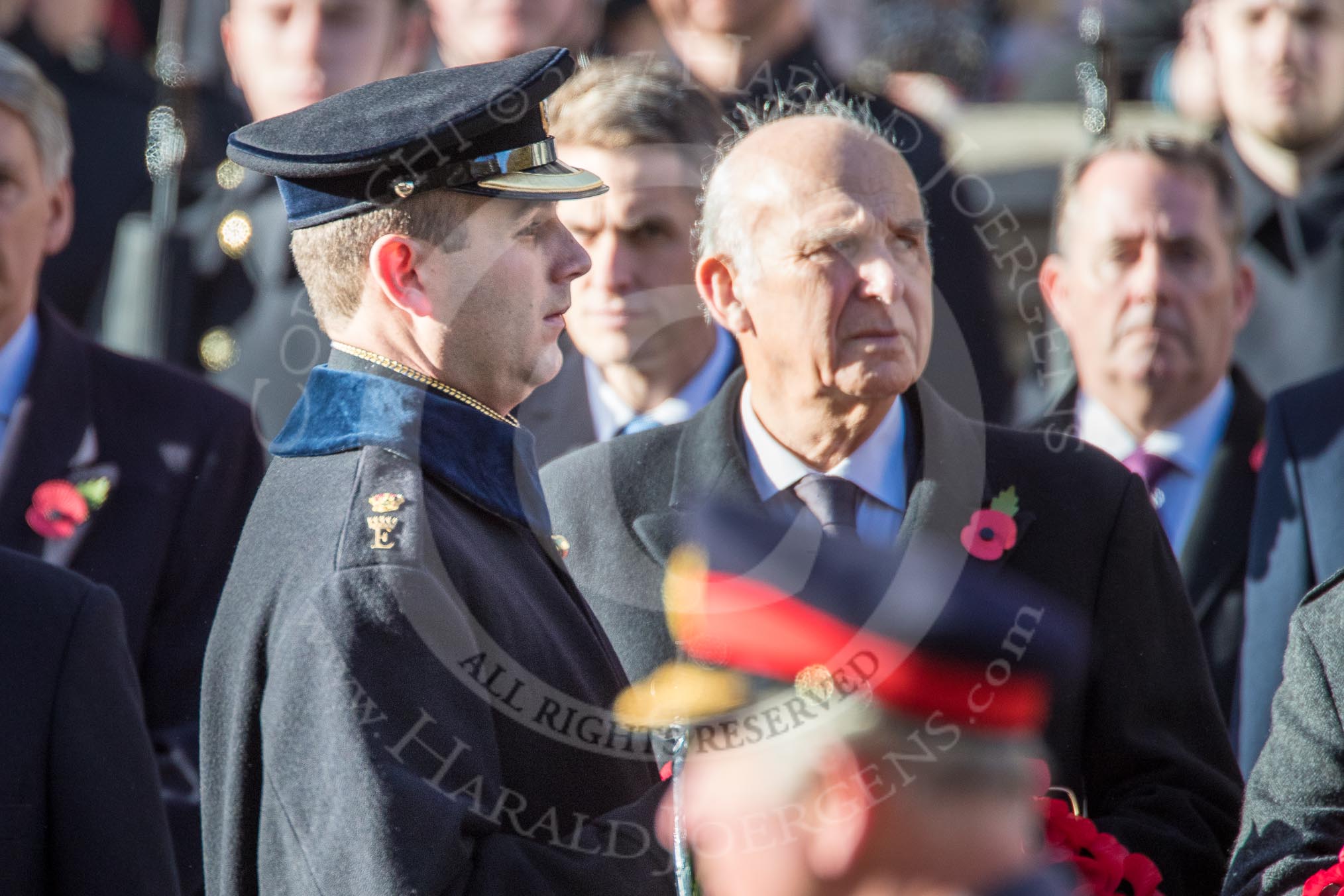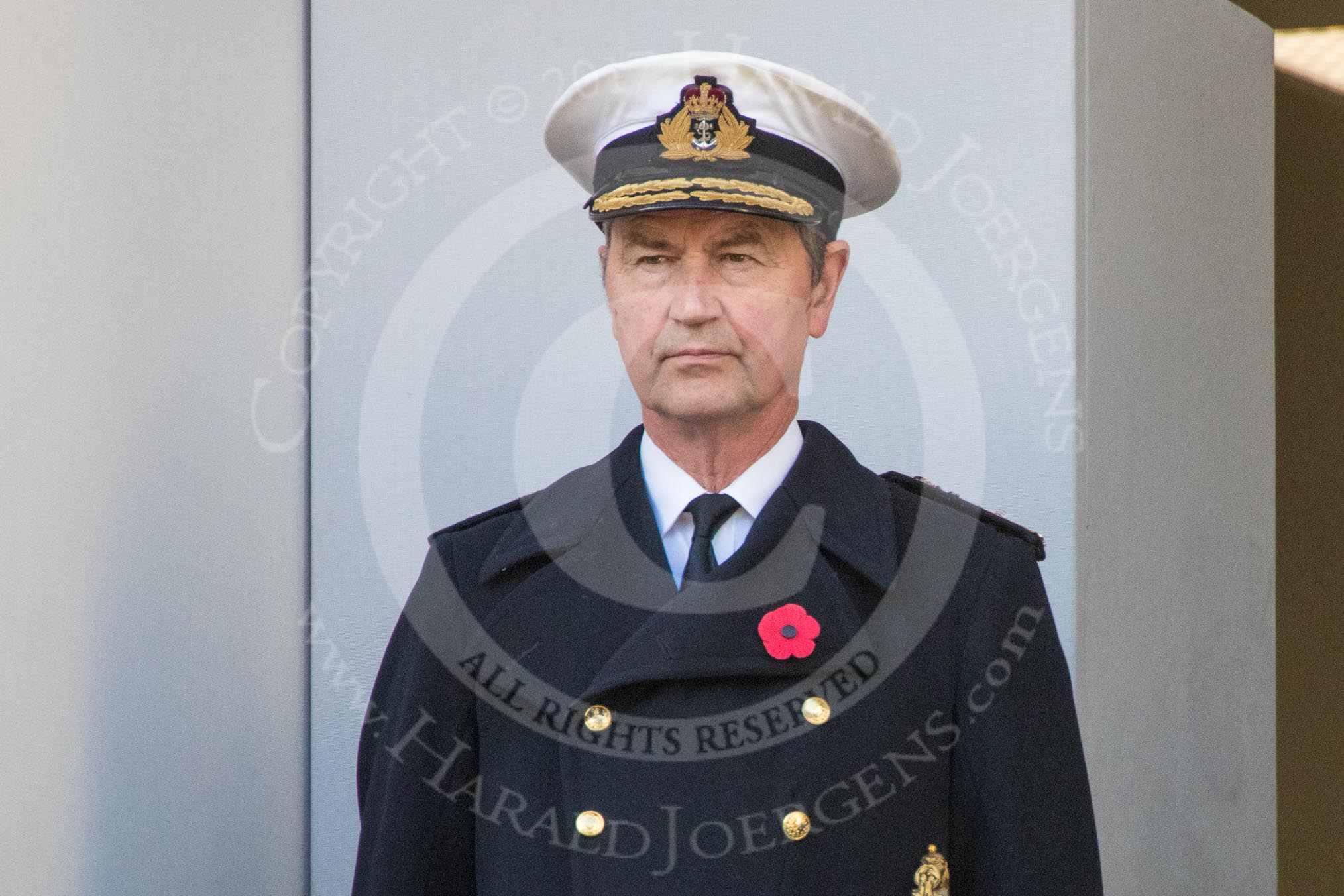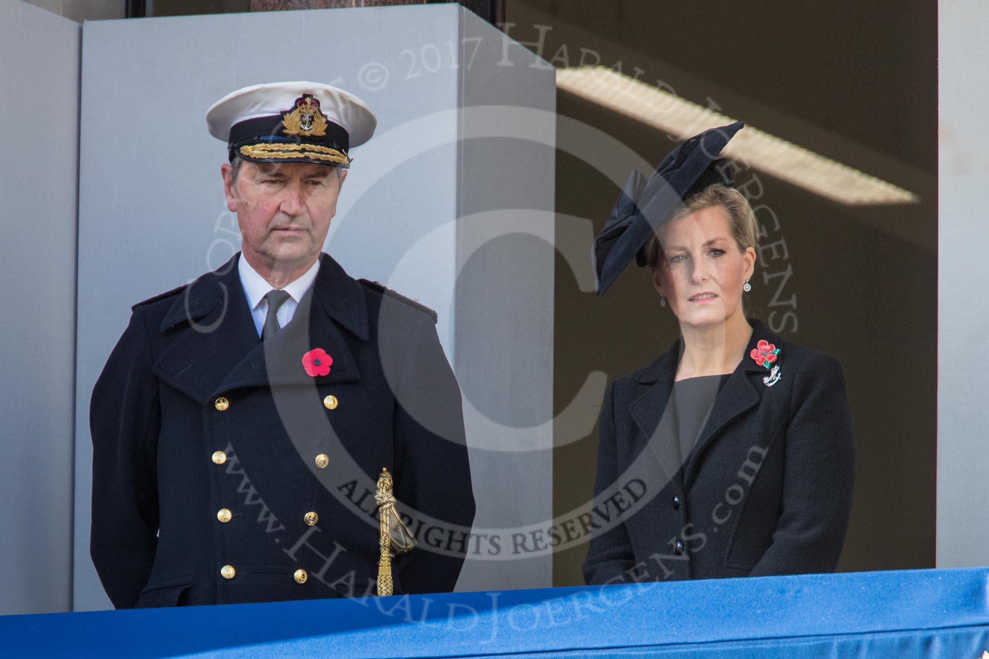 Vice Admiral Sir Tim Laurence, husband of HRH The Princess Royal and HRH The Countess of Wessex (Sophie) on the balcony of the Foreign and Commonwealth Office during the Remembrance Sunday Cenotaph Ceremony 2018 at Horse Guards Parade, Westminster, London, 11 November 2018, 10:59.
