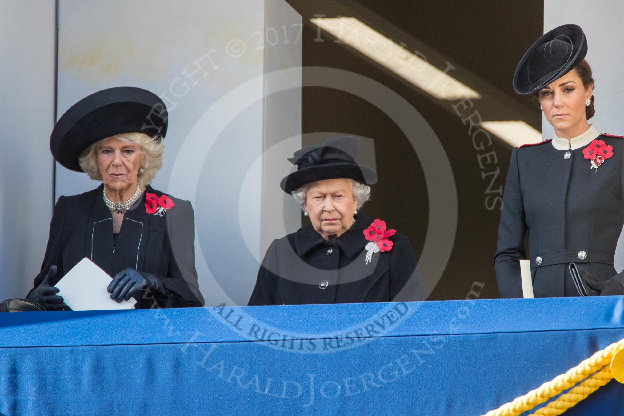 HRH The Duchess of Cornwall (Camilla), Her Majesty The Queen, and HRH The Duchess of Cambridge (Kate) on the balcony of the Foreign and Commonwealth Office during Remembrance Sunday Cenotaph Ceremony 2018 at Horse Guards Parade, Westminster, London, 11 November 2018, 10:59.