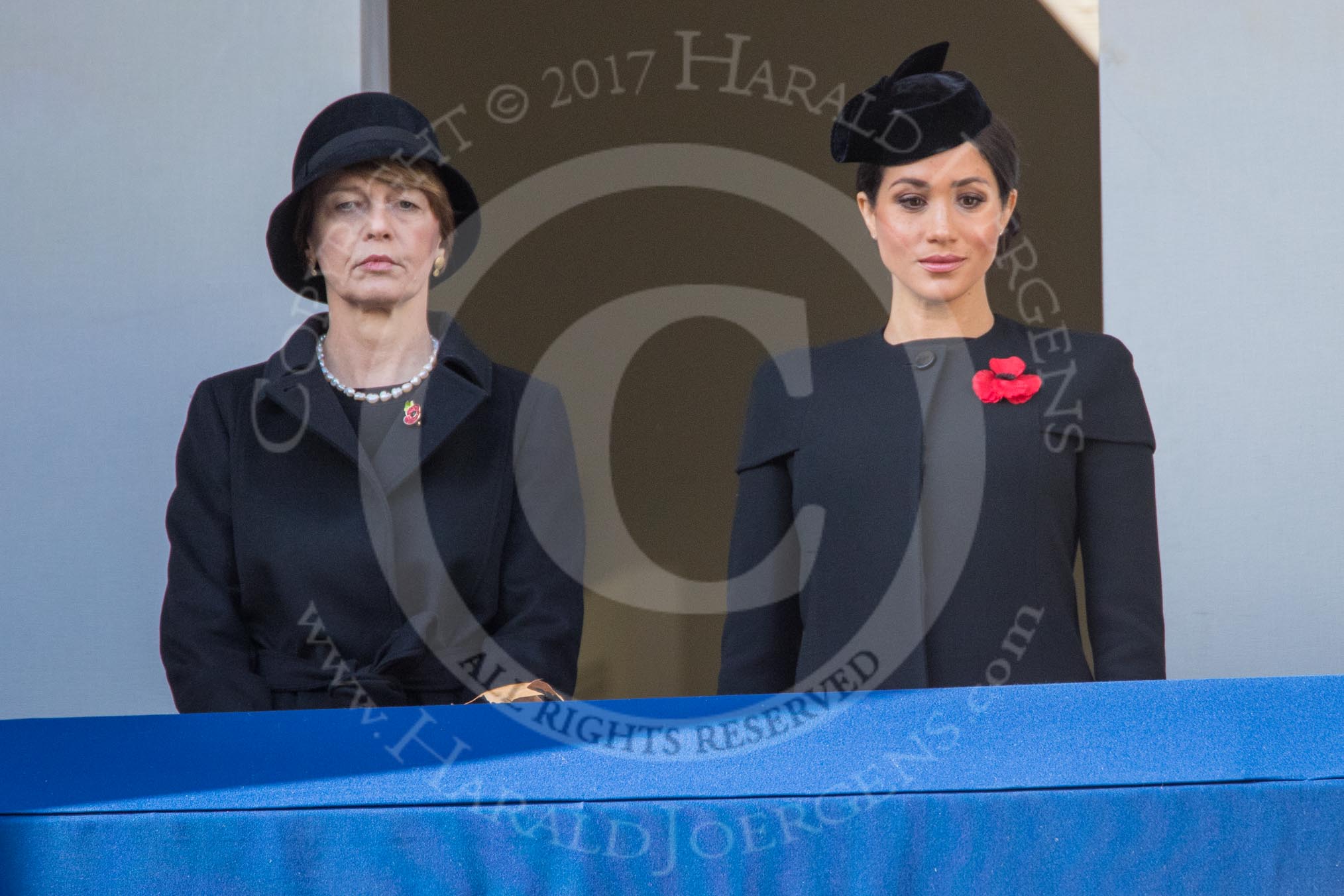 Mrs. Elke Büdenbender, wife of HE The President of the Federal Republic of Germany, Frank-Walter Steinmeier and HRH The Duchess of Sussex (Meghan) on the balcony of the Foreign and Commonwealth Office during the Remembrance Sunday Cenotaph Ceremony 2018 at Horse Guards Parade, Westminster, London, 11 November 2018, 10:59.