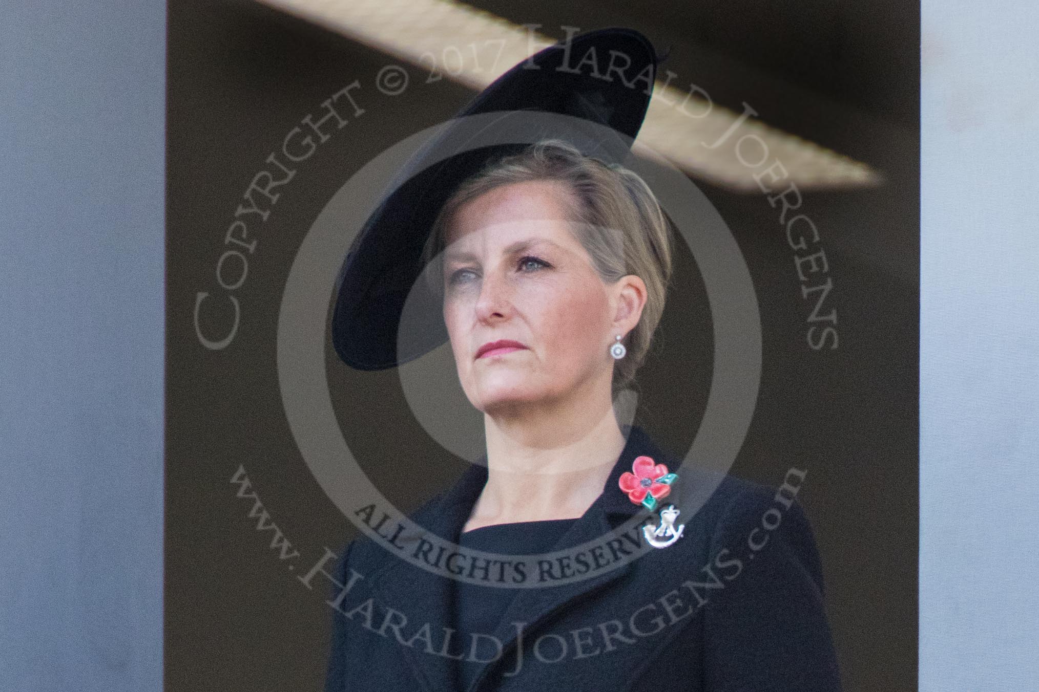 HRH The Countess of Wessex (Sophie) on the balcony of the Foreign and Commonwealth Office during the Remembrance Sunday Cenotaph Ceremony 2018 at Horse Guards Parade, Westminster, London, 11 November 2018, 11:02.