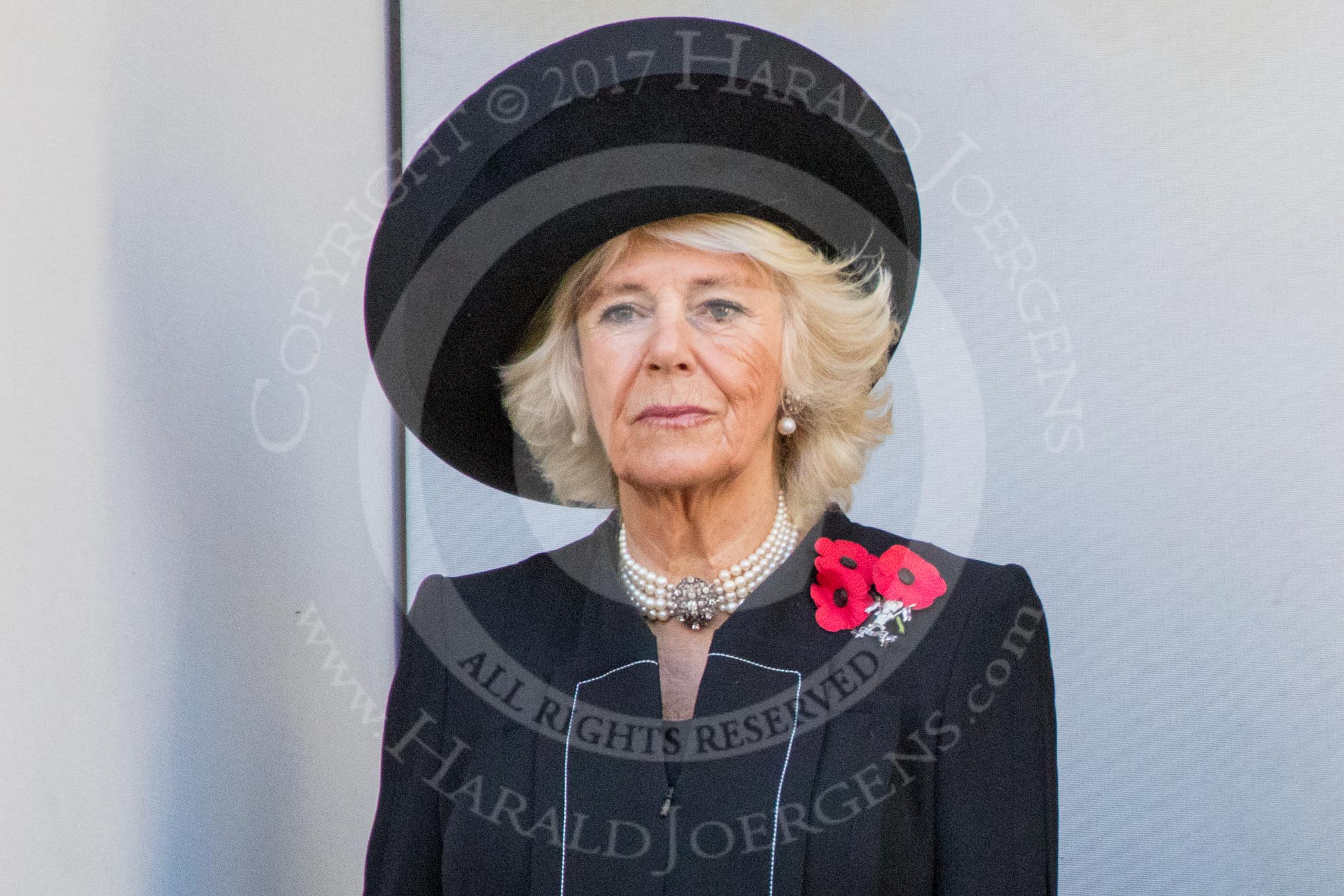 HRH The Duchess of Cornwall (Camilla) on the balcony of the Foreign and Commonwealth Office during the Remembrance Sunday Cenotaph Ceremony 2018 at Horse Guards Parade, Westminster, London, 11 November 2018, 11:02.