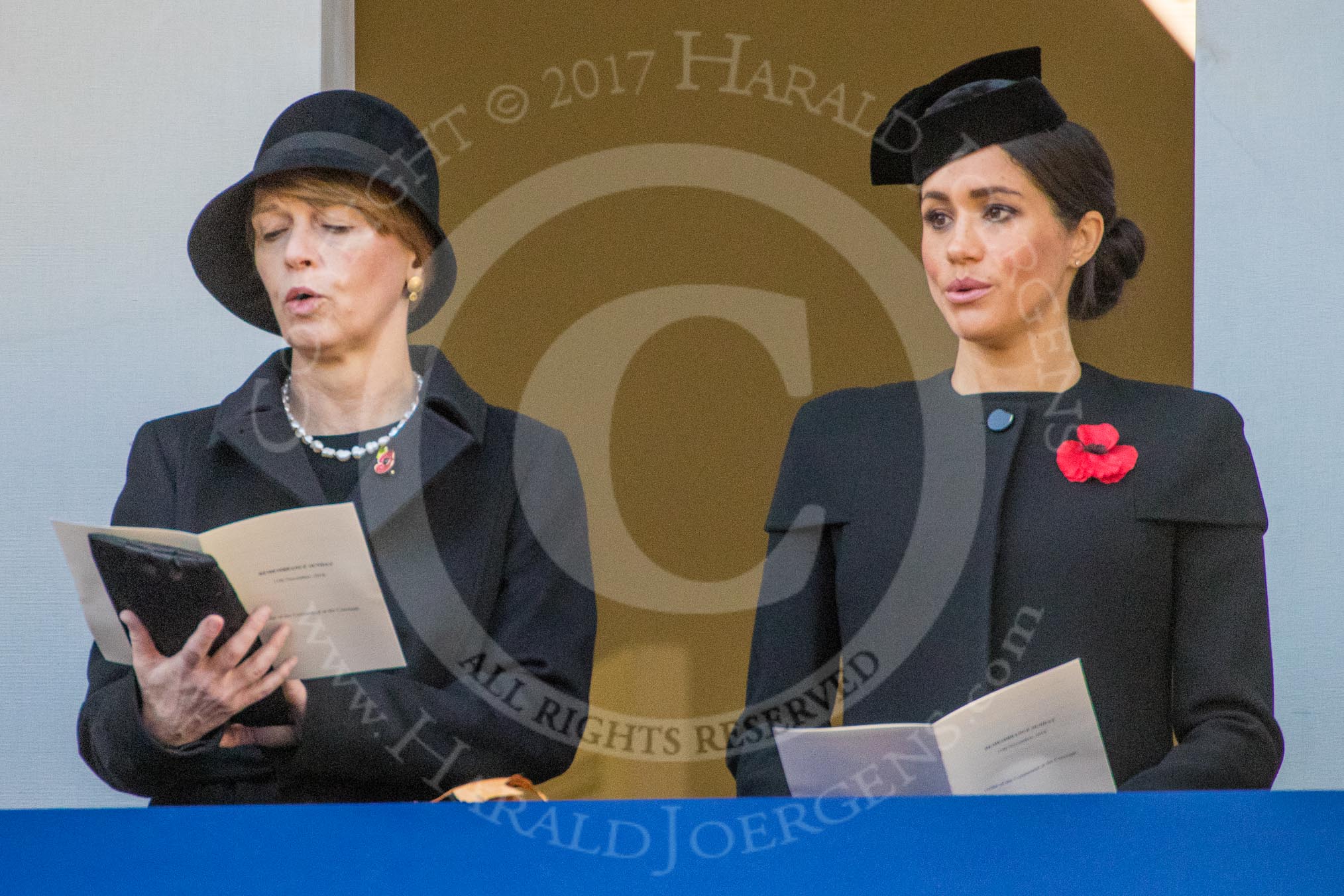 Mrs. Elke Büdenbender, wife of HE The President of the Federal Republic of Germany, Frank-Walter Steinmeier and HRH The Duchess of Sussex (Meghan), singing, on the balcony of the Foreign and Commonwealth Office during the Remembrance Sunday Cenotaph Ceremony 2018 at Horse Guards Parade, Westminster, London, 11 November 2018, 11:18.