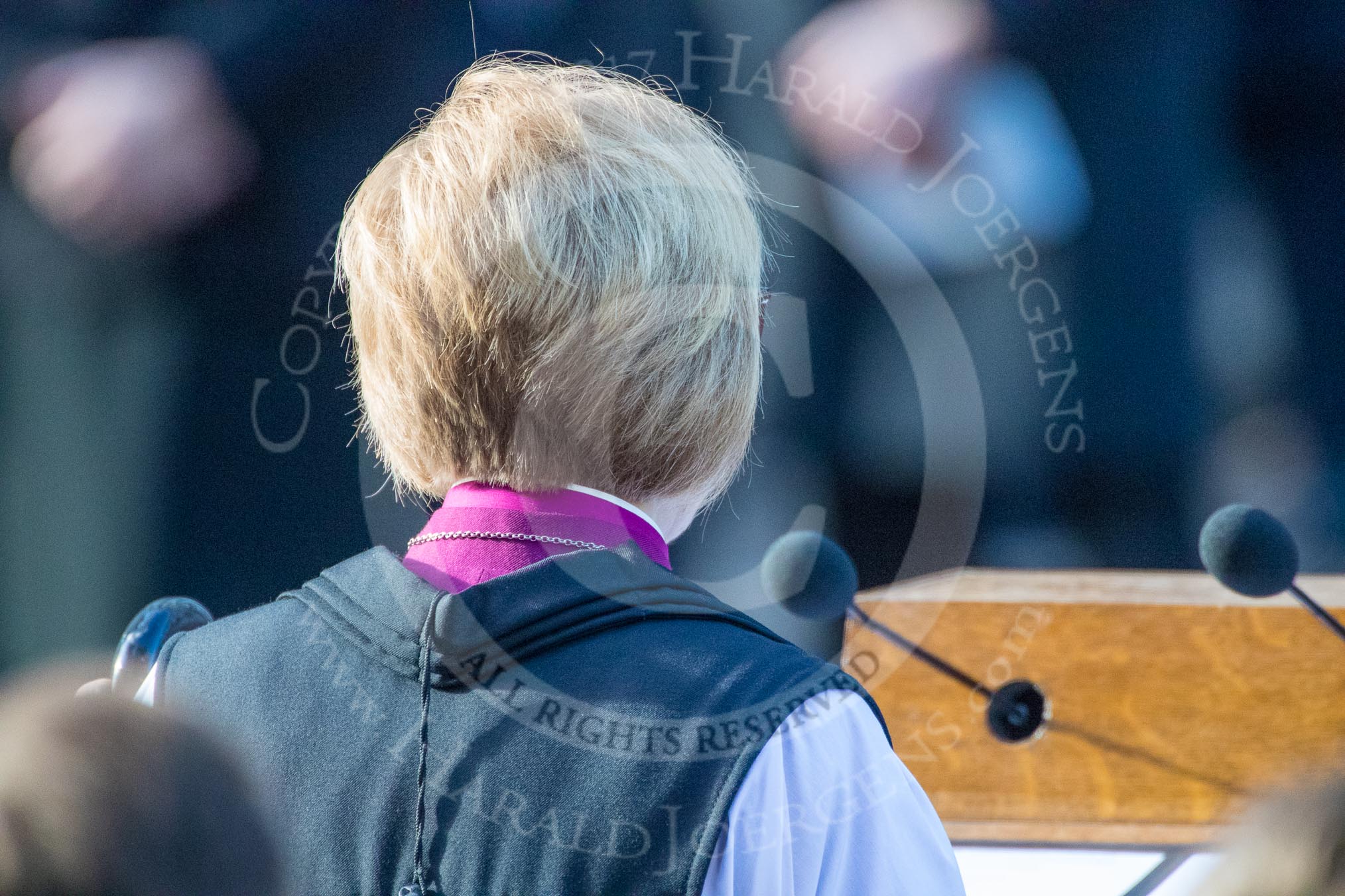 The Right Reverend and Right Honourable Dame Sarah Mullally DBE, the Lord Bishop of London during the service at the Remembrance Sunday Cenotaph Ceremony 2018 at Horse Guards Parade, Westminster, London, 11 November 2018, 11:20.