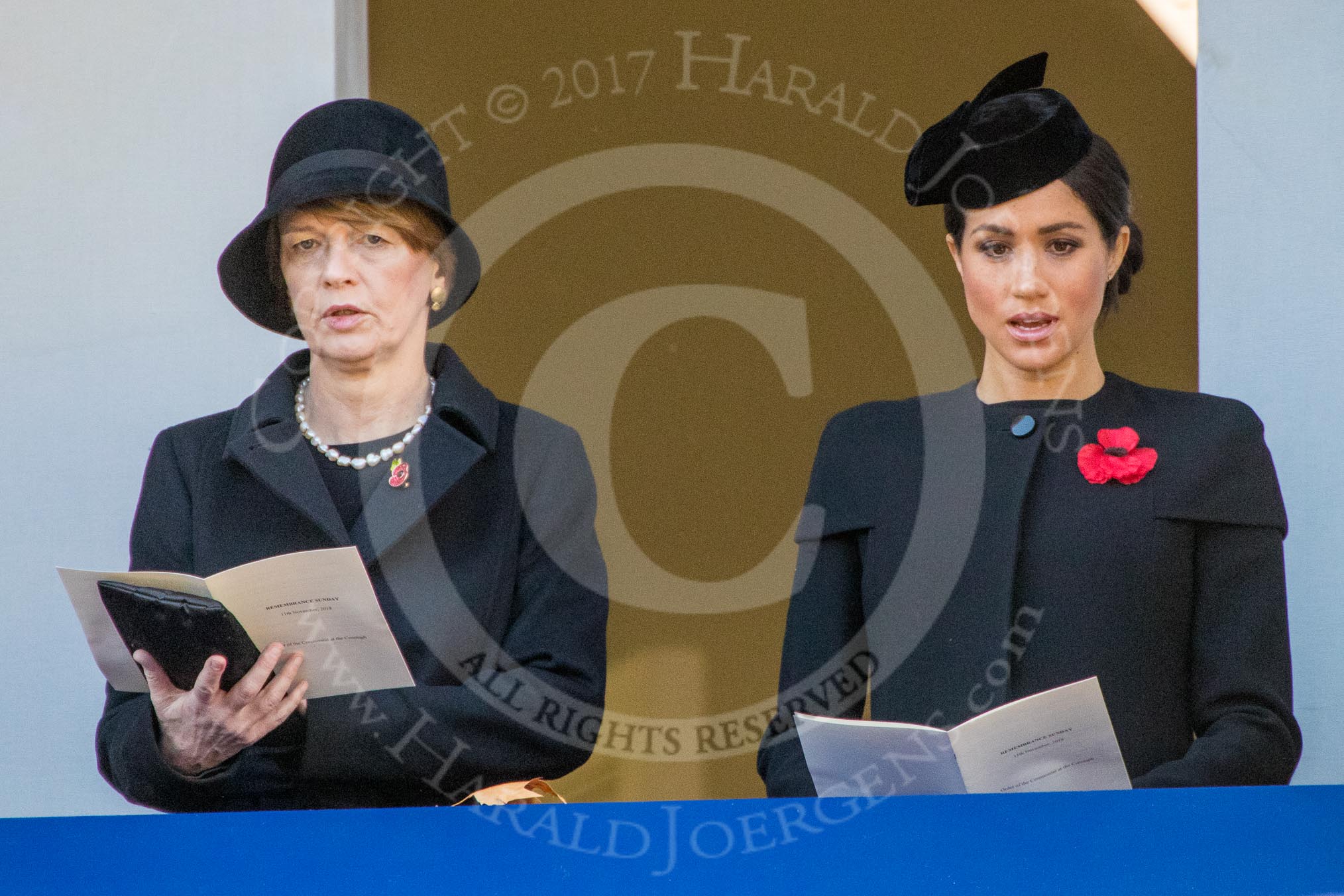 Mrs. Elke Büdenbender, wife of HE The President of the Federal Republic of Germany, Frank-Walter Steinmeier and HRH The Duchess of Sussex (Meghan), singing, on the balcony of the Foreign and Commonwealth Office during the Remembrance Sunday Cenotaph Ceremony 2018 at Horse Guards Parade, Westminster, London, 11 November 2018, 11:19.