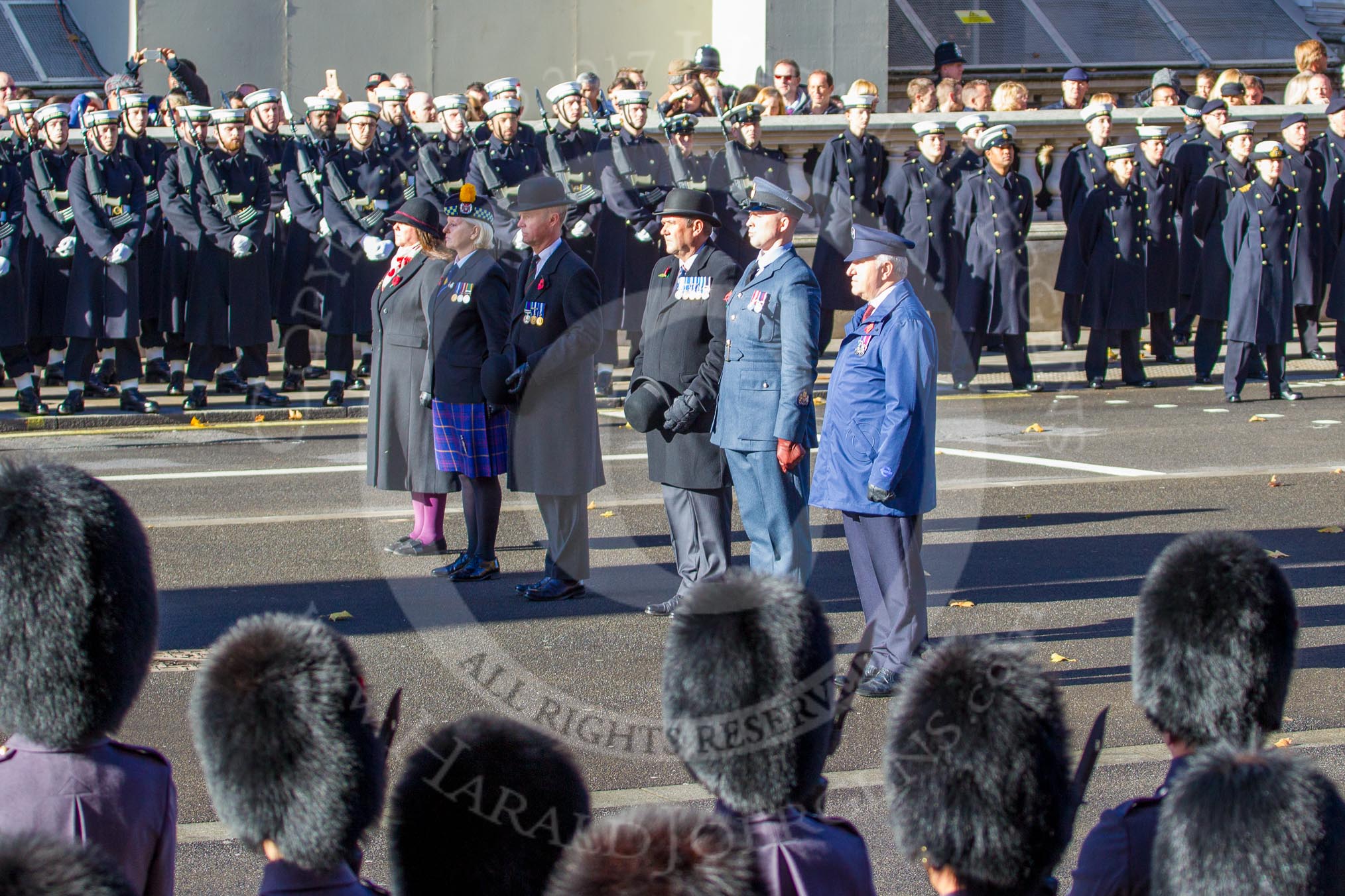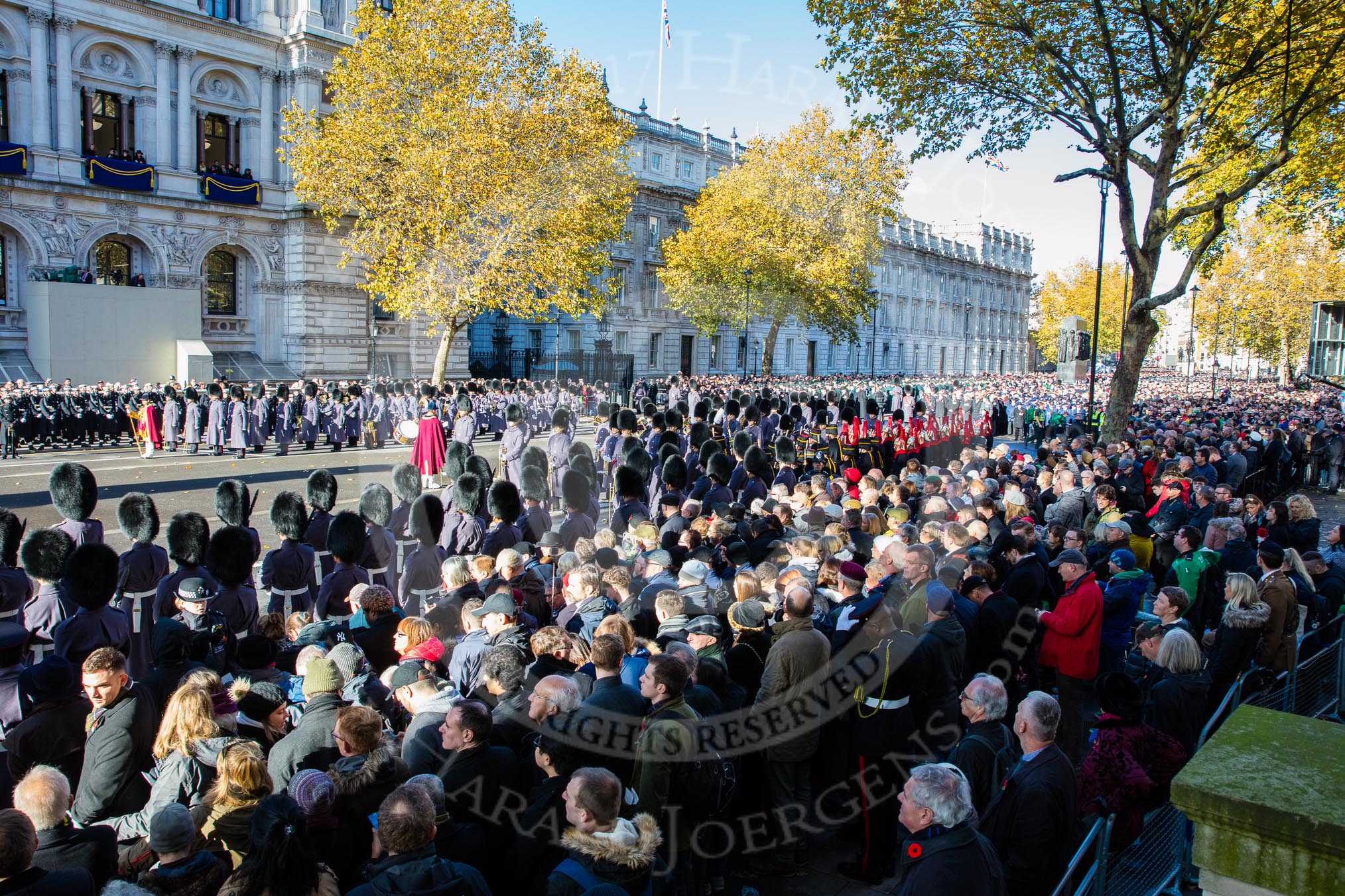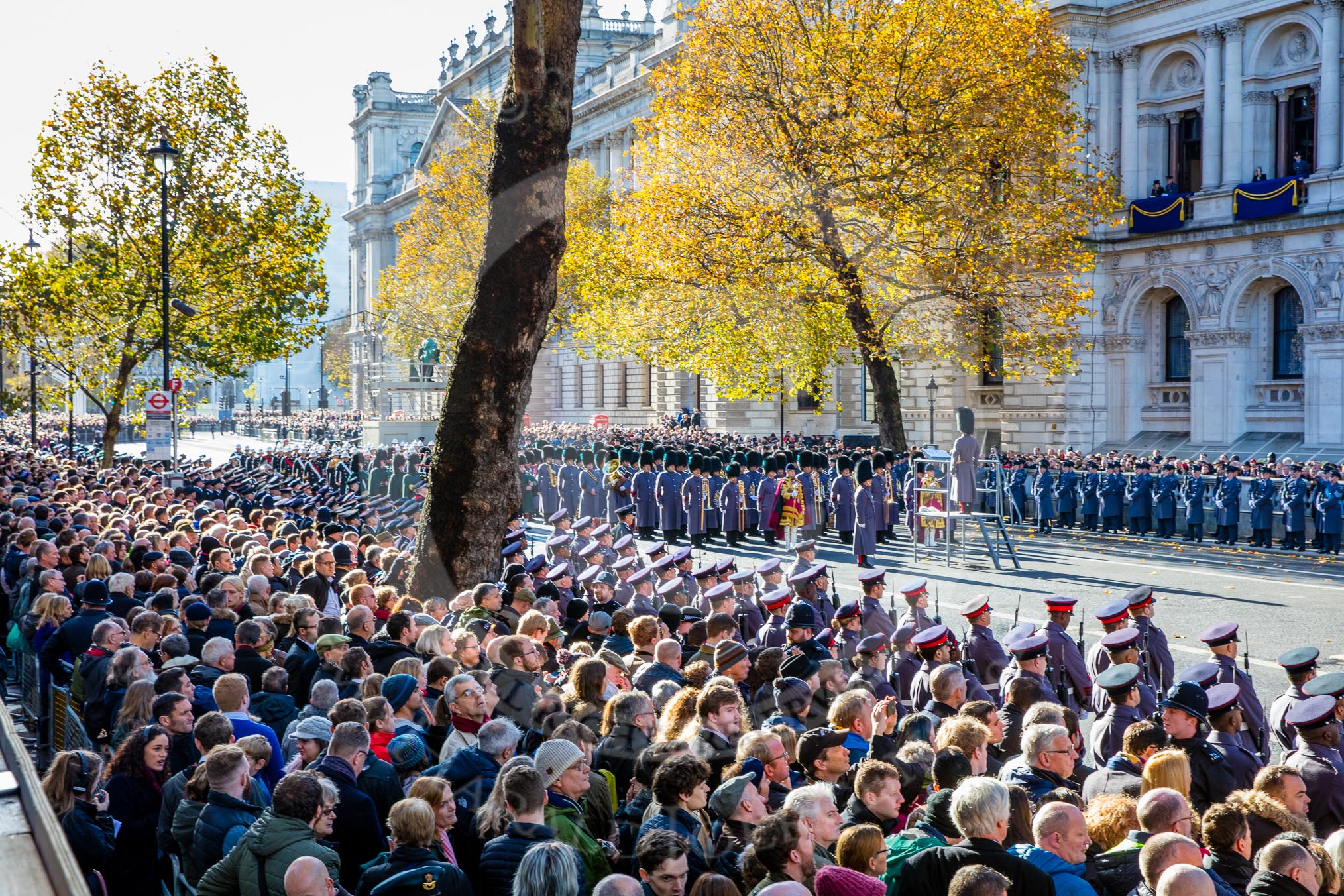 The eastern side of Whitehall, where over 9000 veterans are waiting for the March Past during the Remembrance Sunday Cenotaph Ceremony 2018 at Horse Guards Parade, Westminster, London, 11 November 2018, 11:37.