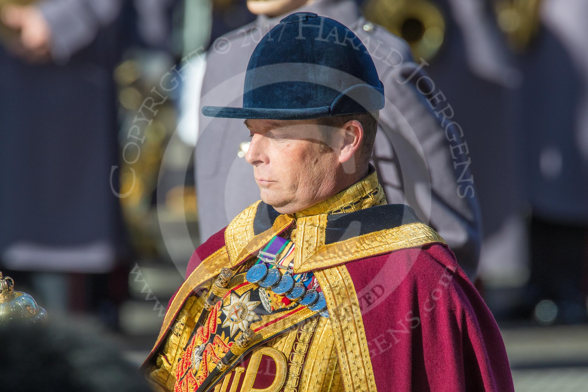 Drum Major Liam Rowley, Coldstream Guards during Remembrance Sunday Cenotaph Ceremony 2018 at Horse Guards Parade, Westminster, London, 11 November 2018, 11:33.