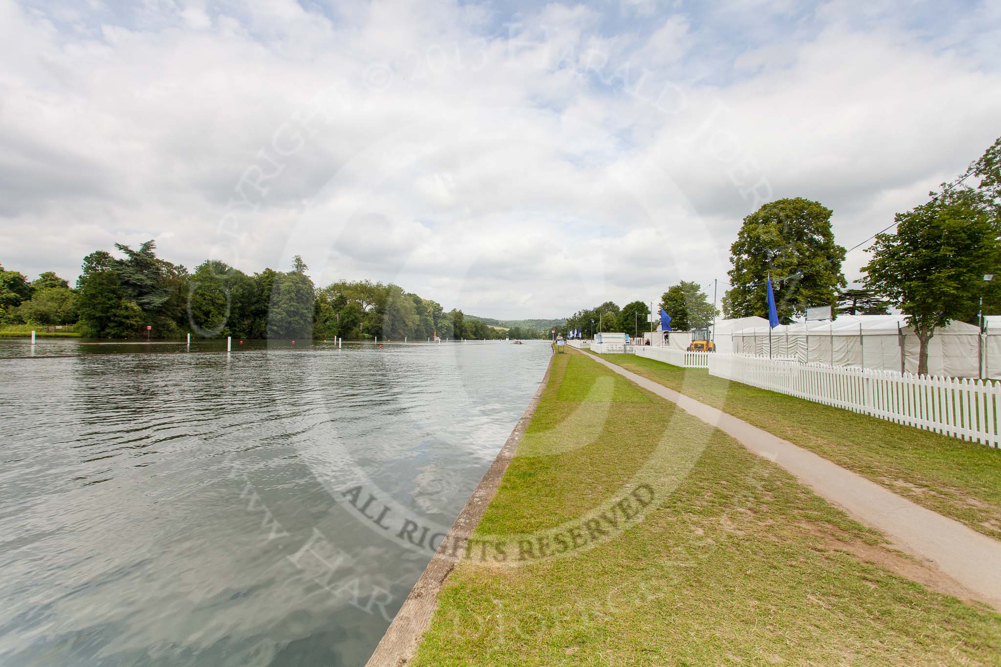 Henley Royal Regatta 2013 (Monday): The final part of the HRR race course seen towards the finish, marked by the blue and white boxes on the left.. River Thames between Henley and Temple Island, Henley-on-Thames, Berkshire, United Kingdom, on 01 July 2013 at 14:42, image #19