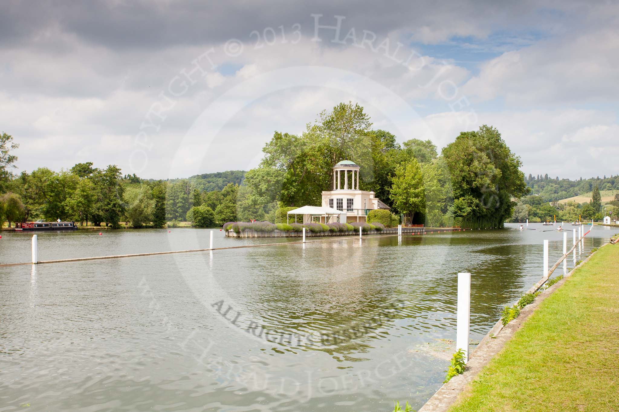 Henley Royal Regatta 2013 (Monday): Temple Island, close to the start of the race, with the ornamental temple originally designed as a fishing lodge for Fawley Court (close to the 1-mile marker).. River Thames between Henley and Temple Island, Henley-on-Thames, Berkshire, United Kingdom, on 01 July 2013 at 14:58, image #23