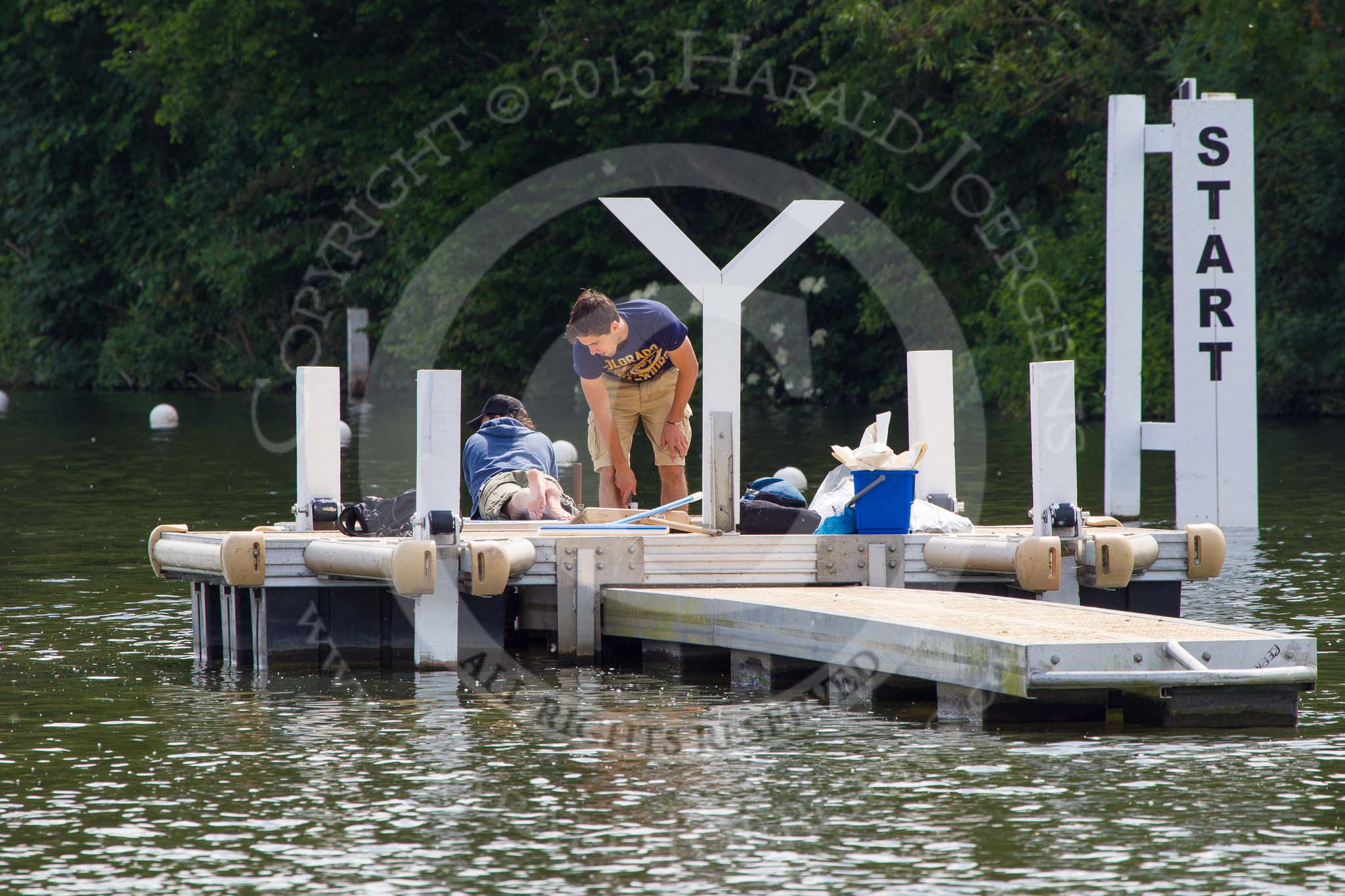 Henley Royal Regatta 2013 (Monday): One of the two start pontoons of the HRR race course.. River Thames between Henley and Temple Island, Henley-on-Thames, Berkshire, United Kingdom, on 01 July 2013 at 15:10, image #31