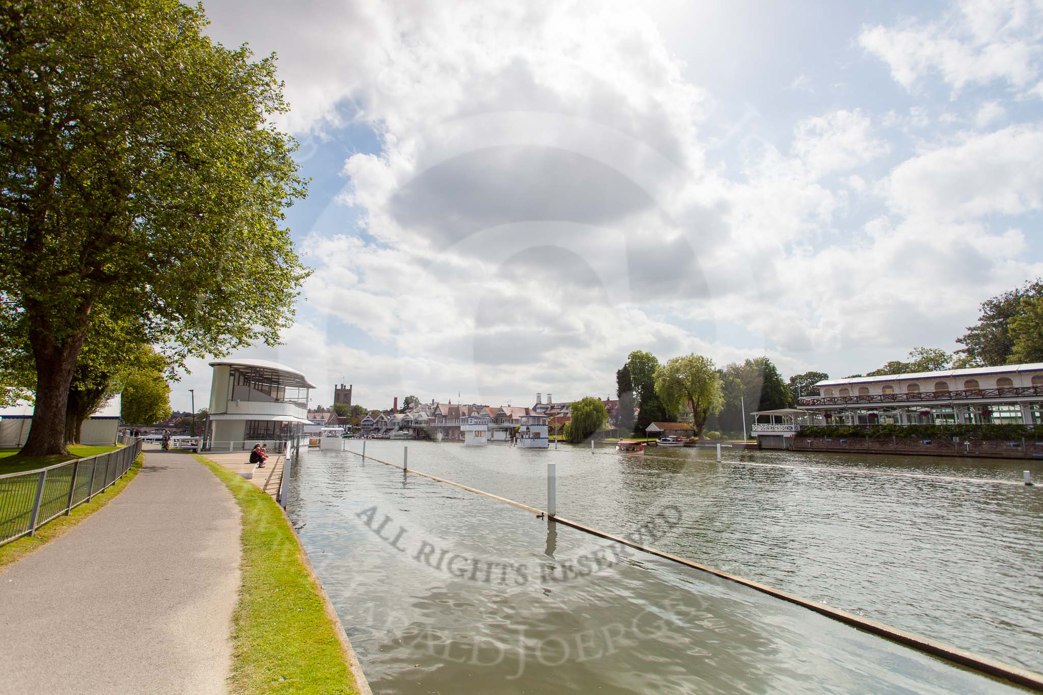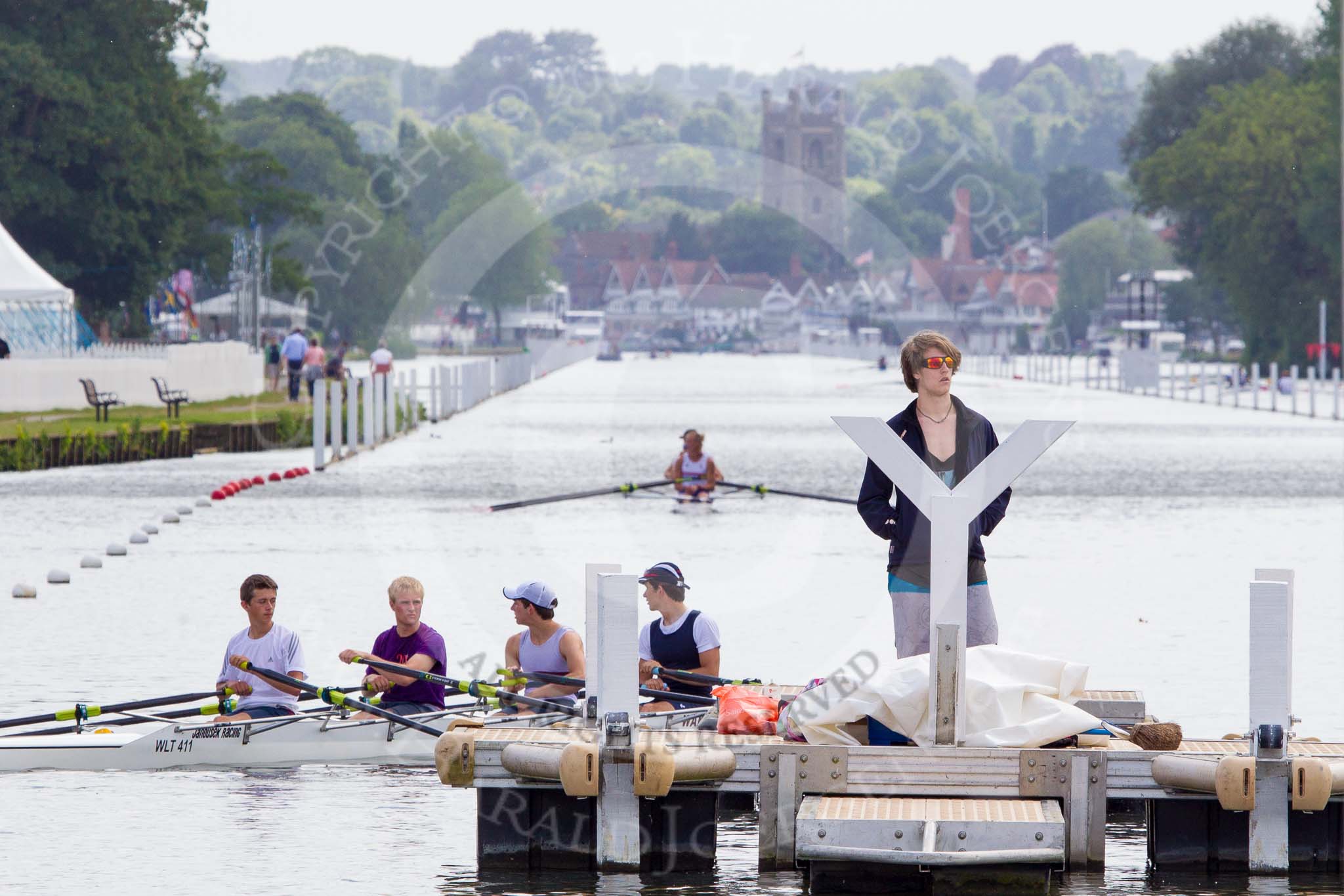 Henley Royal Regatta 2013 (Monday): The long HRR race course visually compressed by a long lens - in front one of the two start pontoons.. River Thames between Henley and Temple Island, Henley-on-Thames, Berkshire, United Kingdom, on 01 July 2013 at 15:10, image #32