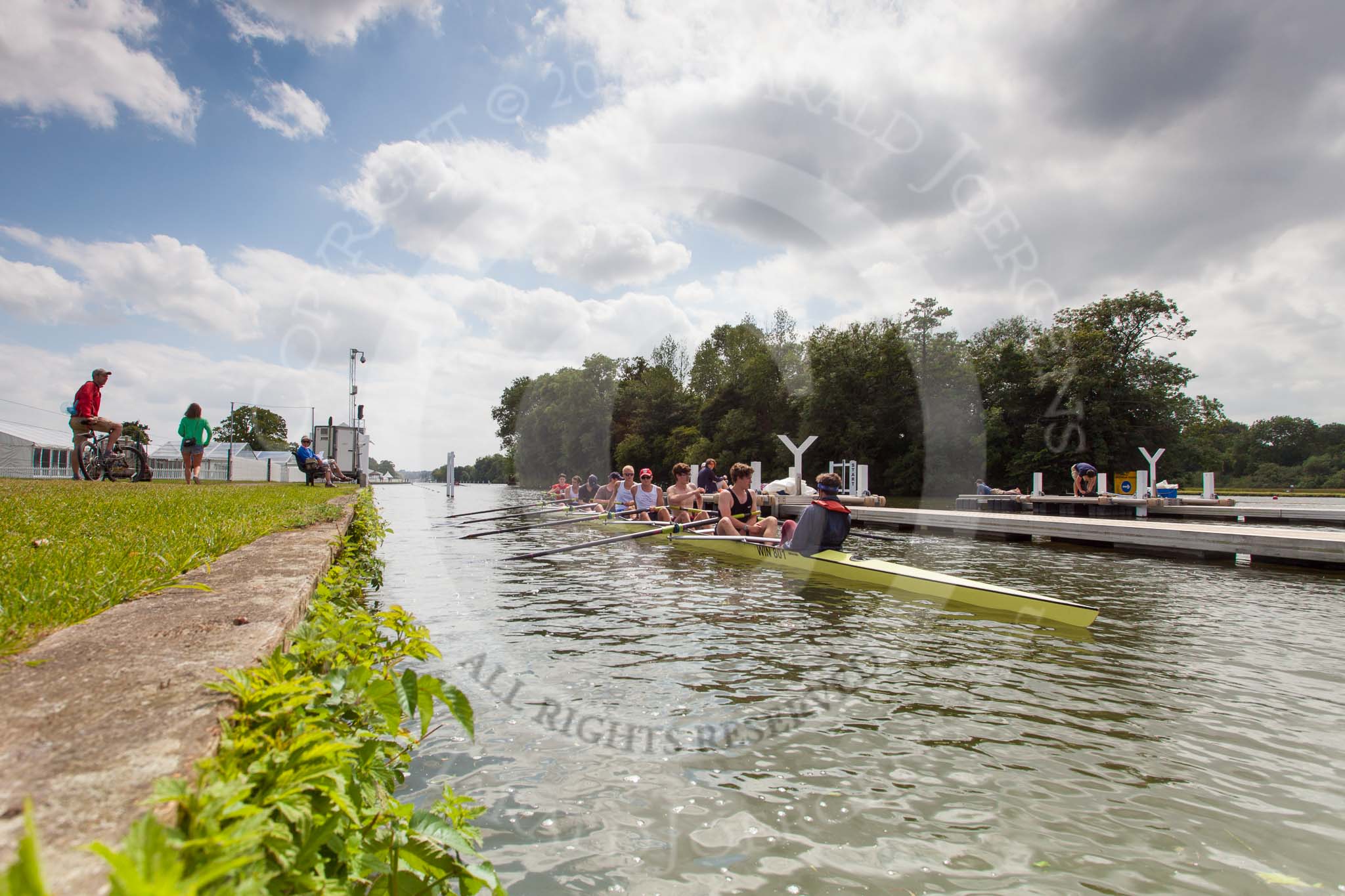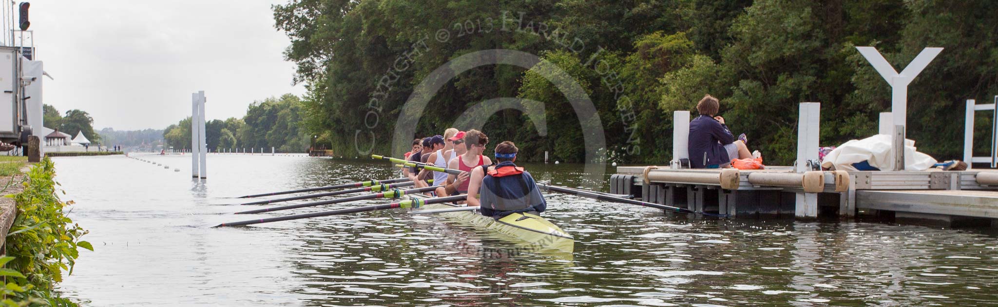 Henley Royal Regatta 2013 (Monday): Approaching the start pontoon of the HRR race course.. River Thames between Henley and Temple Island, Henley-on-Thames, Berkshire, United Kingdom, on 01 July 2013 at 15:14, image #35