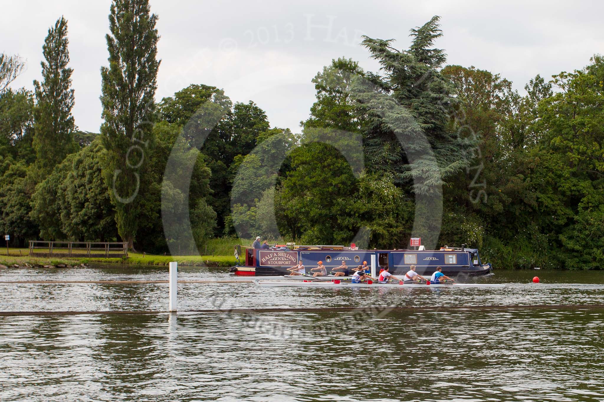 Henley Royal Regatta 2013 (Monday): River traffic two days before the race, narrowboat "Half a Shilling" meeting rowers on the race course whilst being overtaken by a boat on the way to the start line.. River Thames between Henley and Temple Island, Henley-on-Thames, Berkshire, United Kingdom, on 01 July 2013 at 15:28, image #39