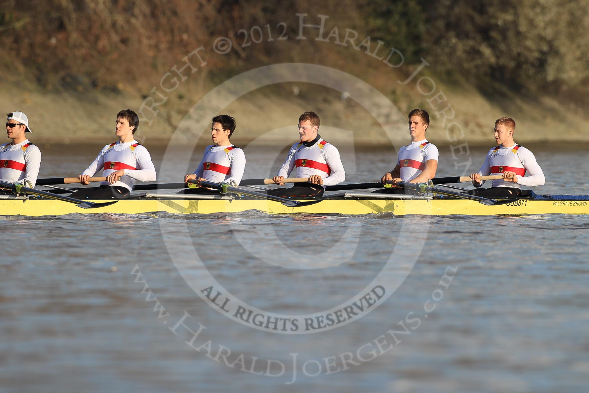 The Boat Race season 2012 - fixture OUBC vs German U23: The German U23 boat, from left to right Maximilian Planer, Malte Jakschik, Alexander Thierfelder, Robin Ponte, Rene Stüven, and Stern Maximilian Johanning.. River Thames between Putney and Mortlake, London, United Kingdom, on 26 February 2012 at 15:21, image #27