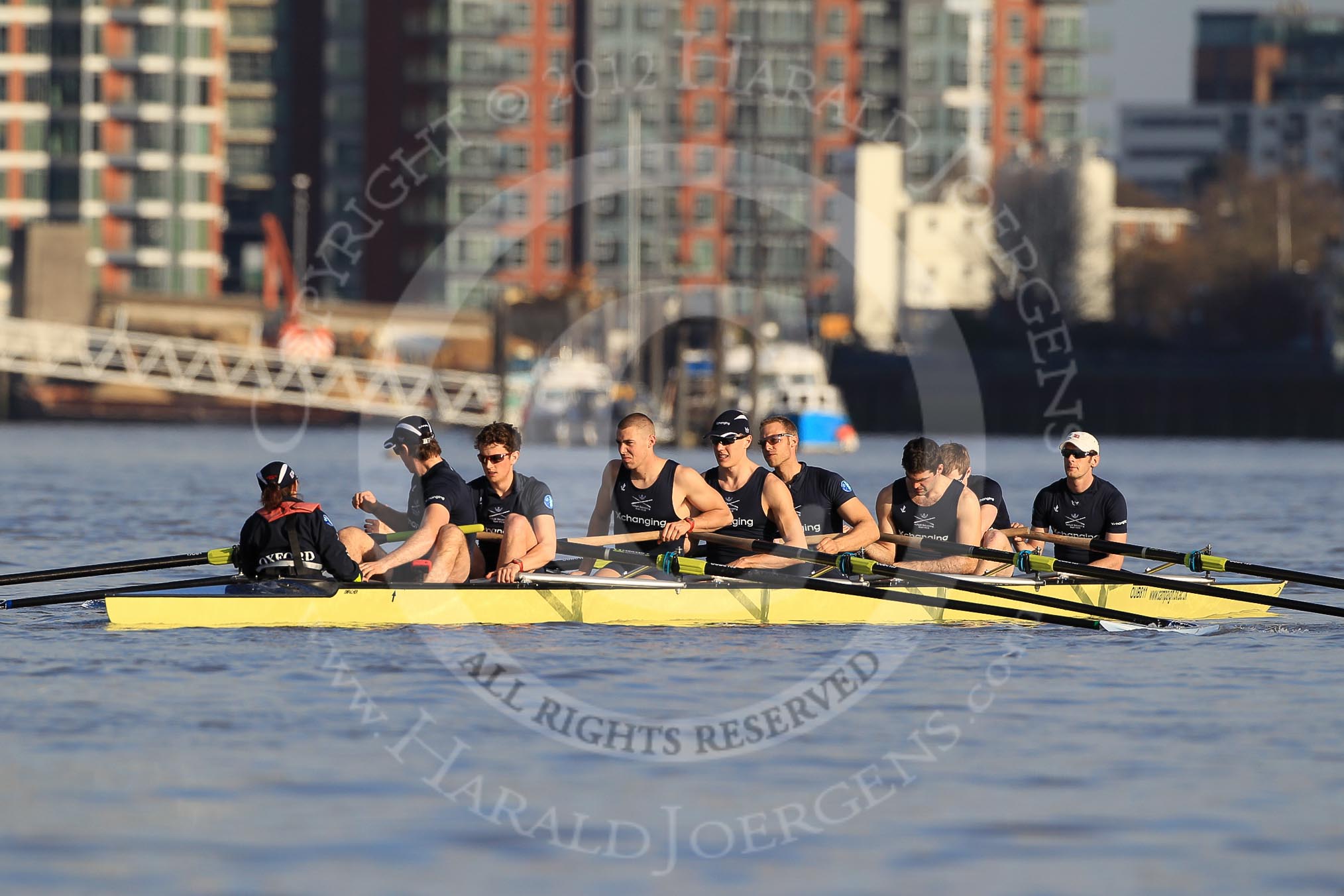 The Boat Race season 2012 - fixture OUBC vs German U23: The OUBC Blue Boat, getting ready for the start of the first race, East of Putney Bridge. From left to right cox Zoe de Toledo, stern Roel Haen, Dan Harvey, Alex Davidson, Karl Hudspith, Dr. Hanno Wienhausen, Kevin Baum, Geordie MacLeod, and bow Dr. Alexander Woods.. River Thames between Putney and Mortlake, London, United Kingdom, on 26 February 2012 at 15:21, image #28