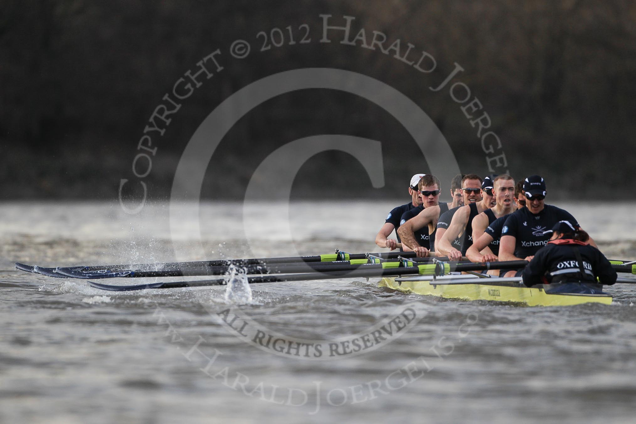The Boat Race season 2012 - fixture OUBC vs German U23: Oxford Blue Boat after winning the second race from Chiswick Eyot to The Boat Race finish at Mortlake..