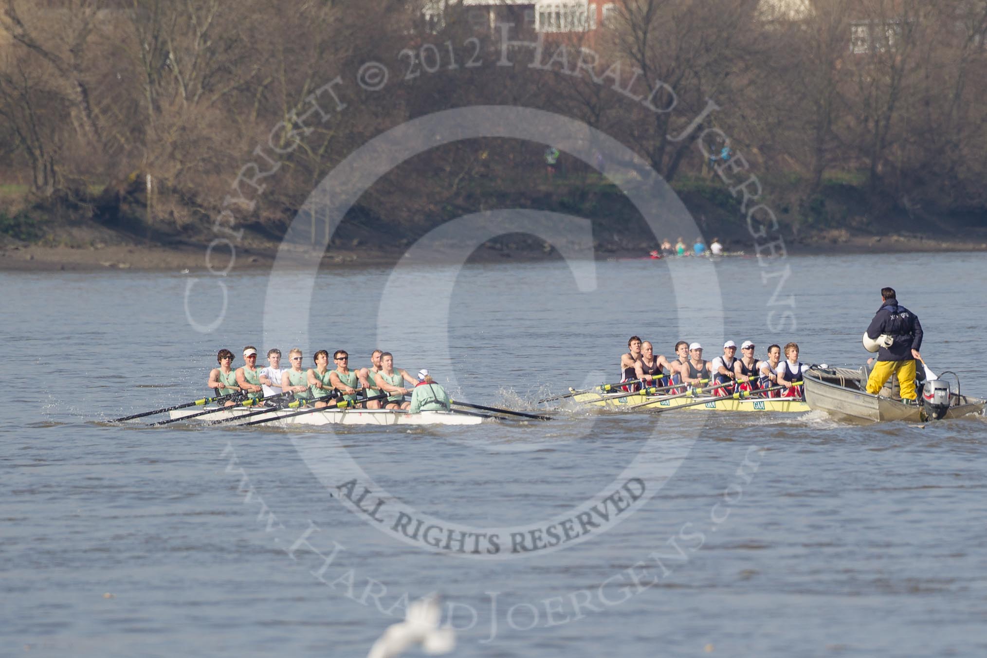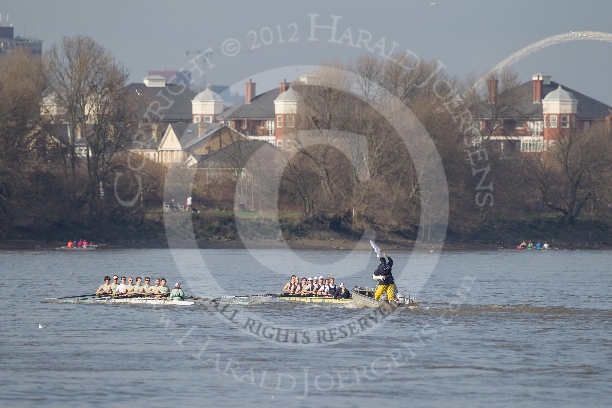 The Boat Race season 2012 - fixture CUBC vs Leander: The Cambridge reserve boat, Goldie, on the left, before the start of the race against the London RC Eight, a strong team with two former British Olympians. Behind them umpire Richard Phelps.. River Thames between Putney and Molesey, London, Greater London, United Kingdom, on 10 March 2012 at 13:48, image #63