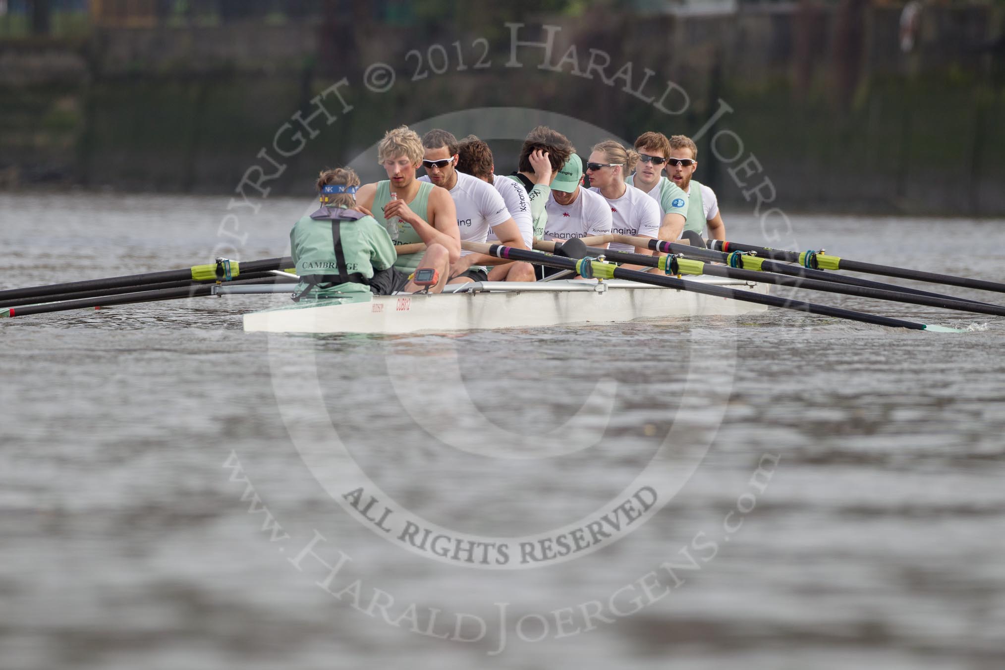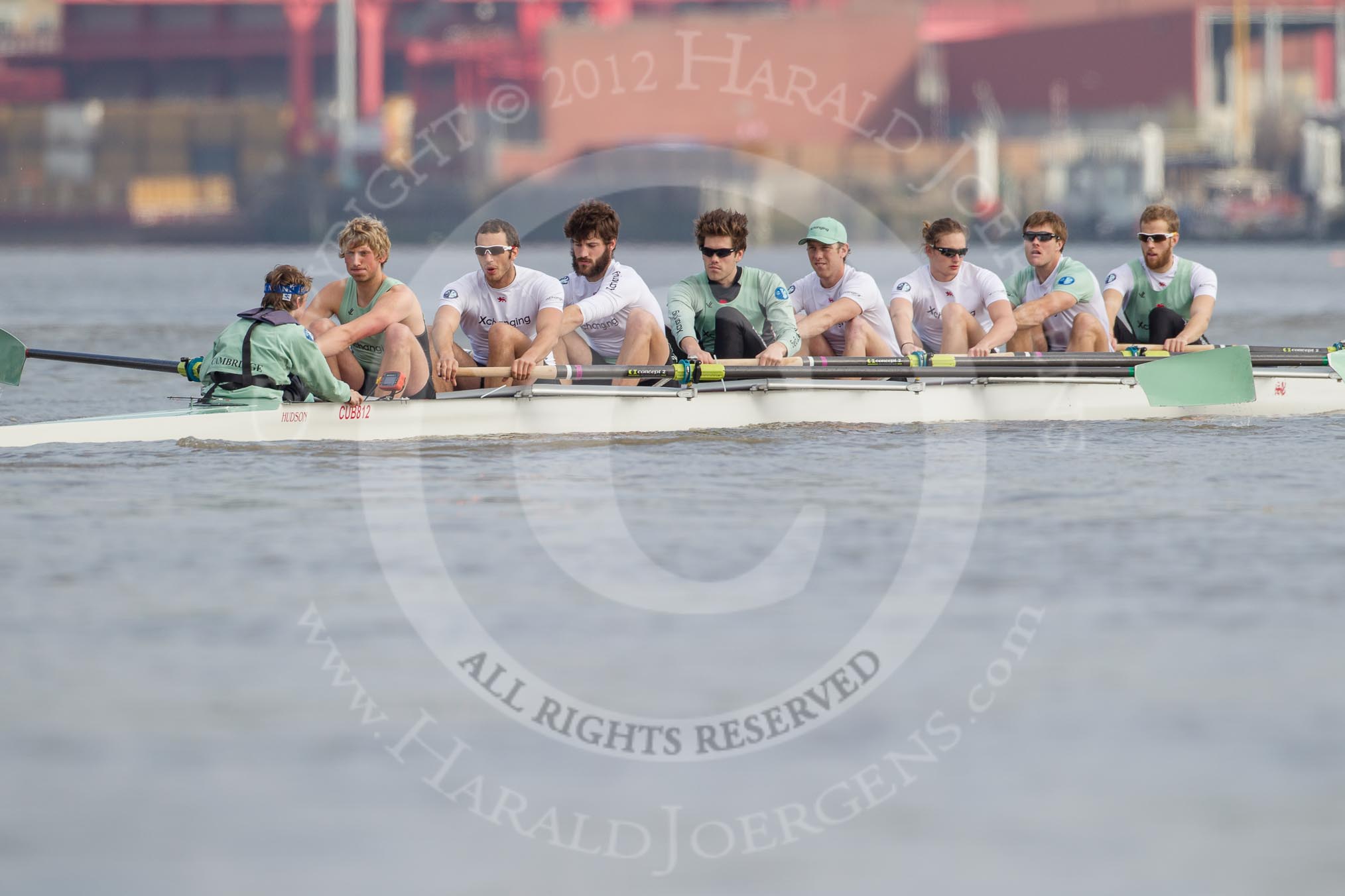 The Boat Race season 2012 - fixture CUBC vs Leander: CUBC Blue Boat: Cox Ed Bosson, stroke Niles Garratt, Alex Ross, Steve Dudek, Alexander Scharp, Jack Lindeman, Mike Thorp, David Nelson, and bow Moritz Schramm.. River Thames between Putney and Molesey, London, Greater London, United Kingdom, on 10 March 2012 at 14:03, image #65