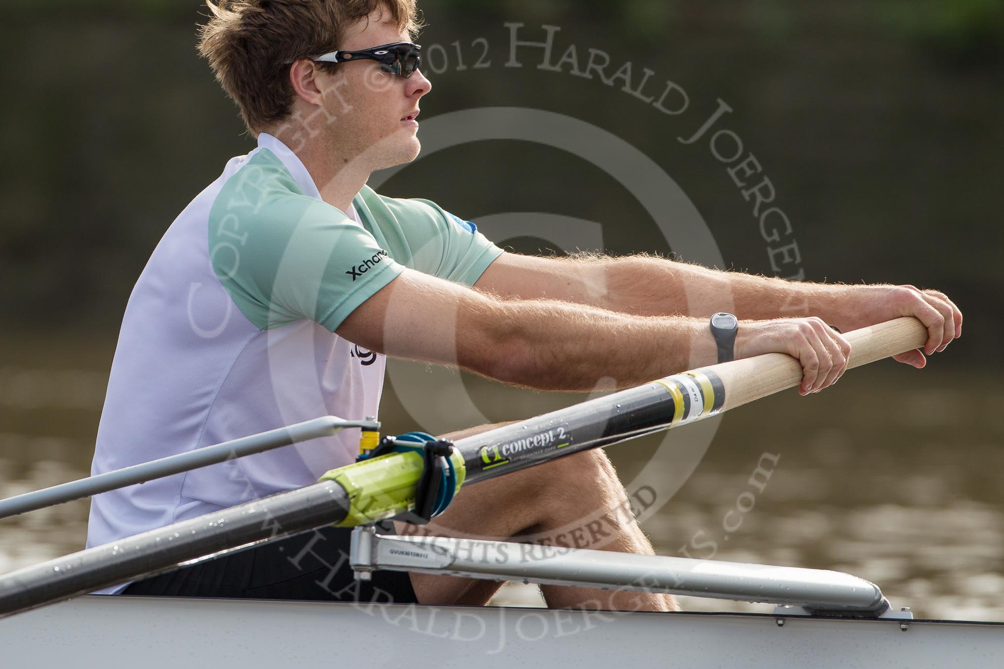 The Boat Race season 2012 - fixture CUBC vs Leander: Close-up of CUBC 3 seat Michael Thorp.. River Thames between Putney and Molesey, London, Greater London, United Kingdom, on 10 March 2012 at 14:06, image #71
