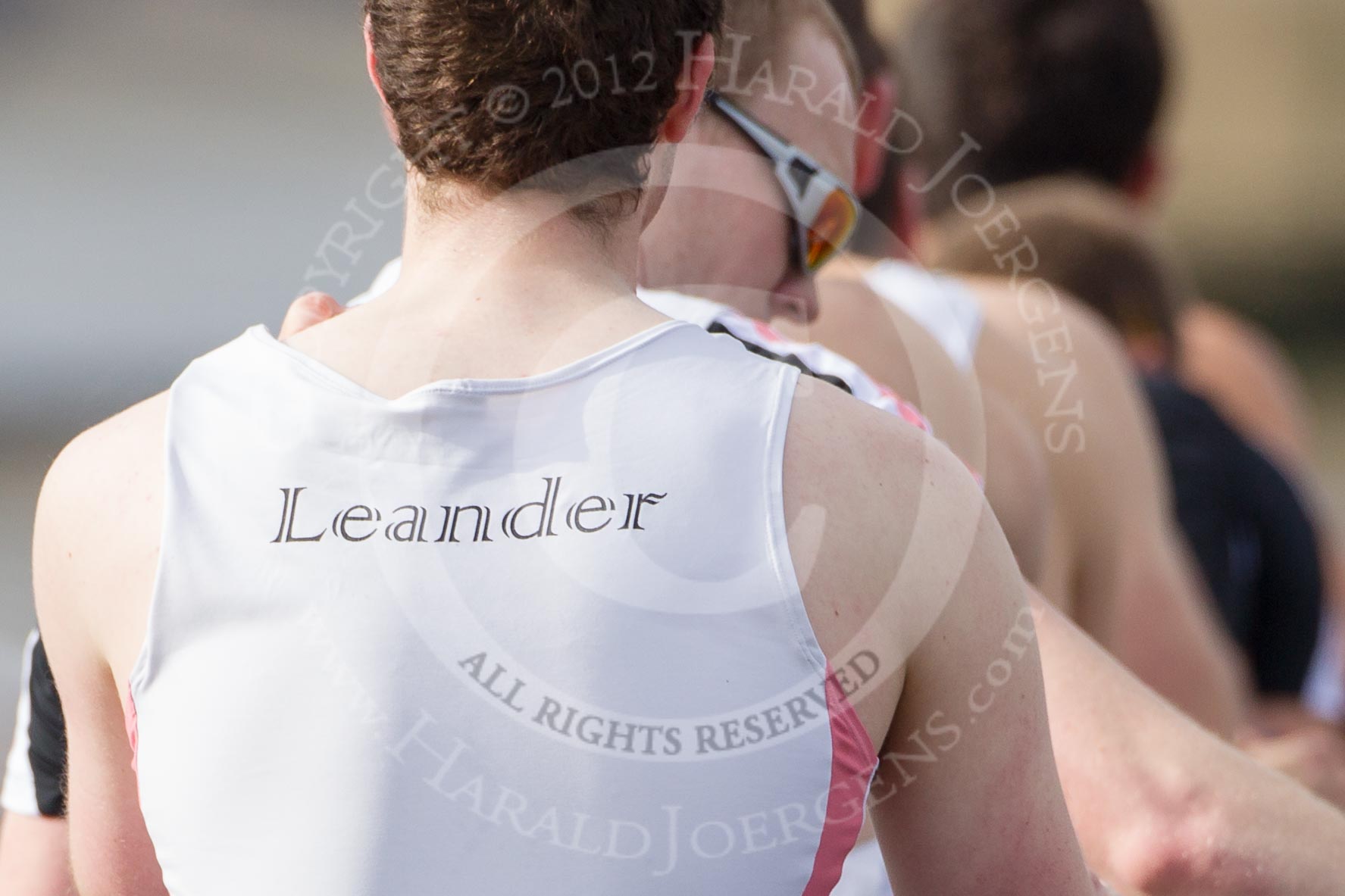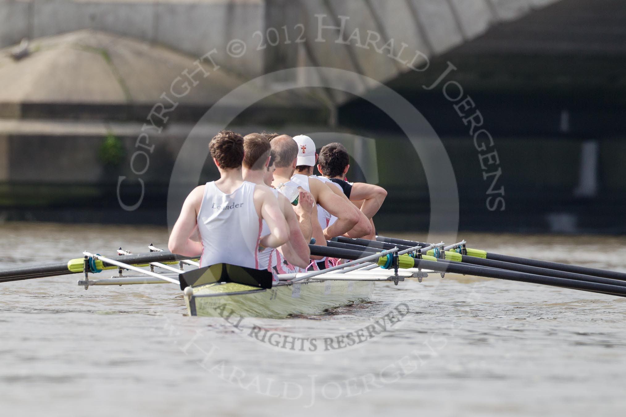 The Boat Race season 2012 - fixture CUBC vs Leander: The Leander Club Eight preparing for the start of the race.. River Thames between Putney and Molesey, London, Greater London, United Kingdom, on 10 March 2012 at 14:07, image #77