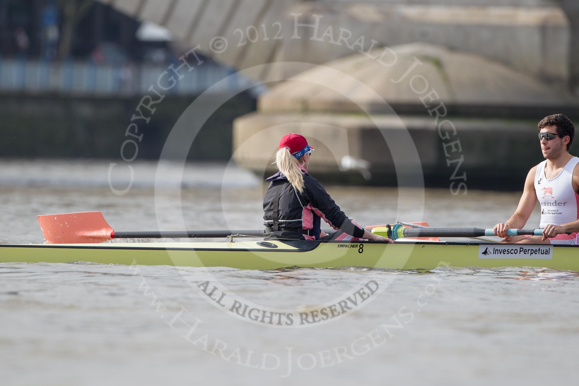 The Boat Race season 2012 - fixture CUBC vs Leander: The Leander Club Eight preparing for the start of the race at Putney Bridge. Cox Katie Klavenes, stroke Vasillis Ragoussis.. River Thames between Putney and Molesey, London, Greater London, United Kingdom, on 10 March 2012 at 14:10, image #85