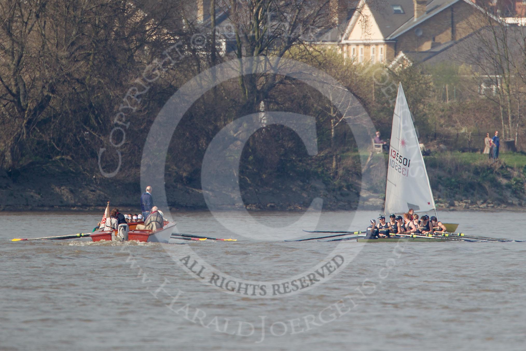 The Boat Race season 2012 - fixture OUBC vs Leander: Umpire Boris Rankov red-flagging the race between the Tideway Scullers, on the left, rand OUBC's Isis team.. on 24 March 2012 at 14:02, image #88