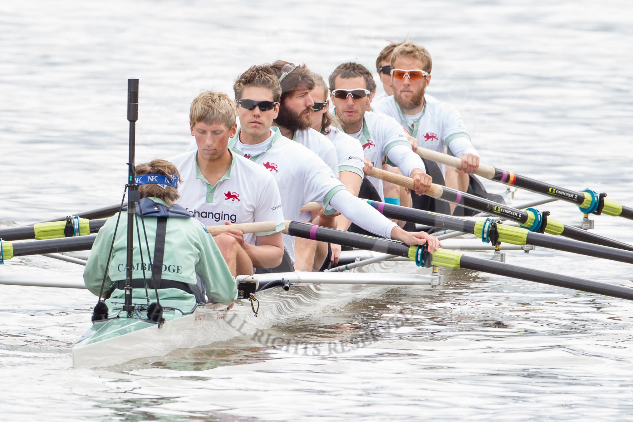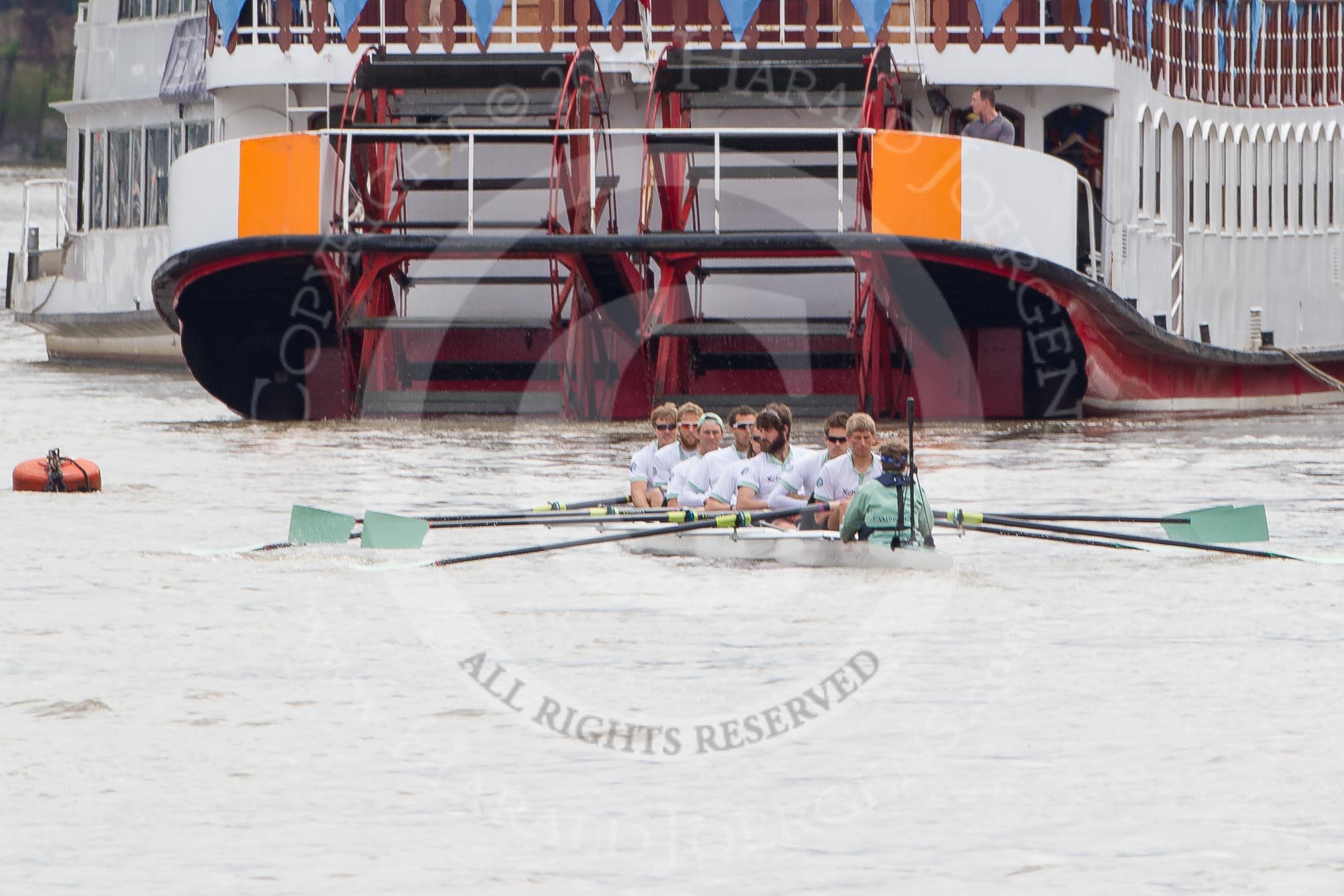 The Boat Race 2012: The Cambridge Blue Boat on the way to the start of the 2012 Boat Race. Cox Ed Bosson, stroke Niles Garratt, Alexander Scharp, Steve Dudek, Mike Thorp, Alex Ross, Jack Lindeman, Moritz Schramm, and bow David Nelson..