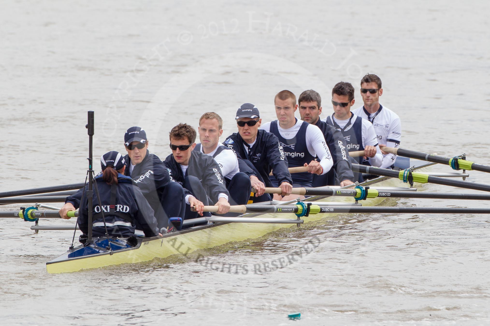 The Boat Race 2012: The Oxford Blue Boat on the way to the start of the 2012 Boat Race. Cox Zoe de Toledo, stroke Roel Haen, 7 Dan Harvey, 6 Dr. Hanno Wienhausen, 5 Karl Hudspith, 4 Alexander Davidson, 3 Kevin Baum, 2 William Zeng, and bow Dr. Alexander Woods..