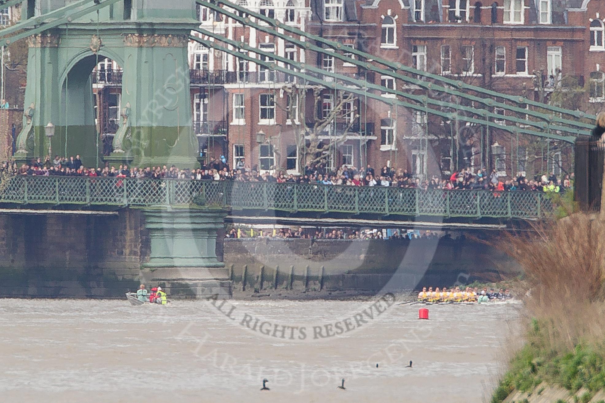 The Boat Race 2012: The Isis v Goldie Boat Race. The Oxford reserve boat Isis, in blue, in the lead, approaching Hammersmith Bridge, the Goldie crew in yellow..