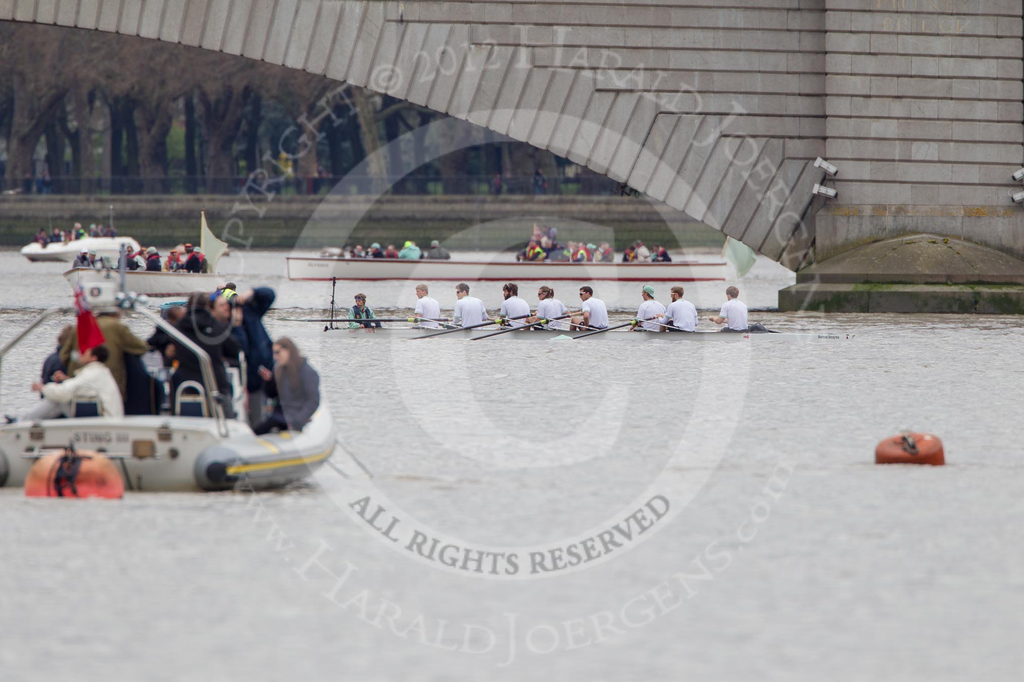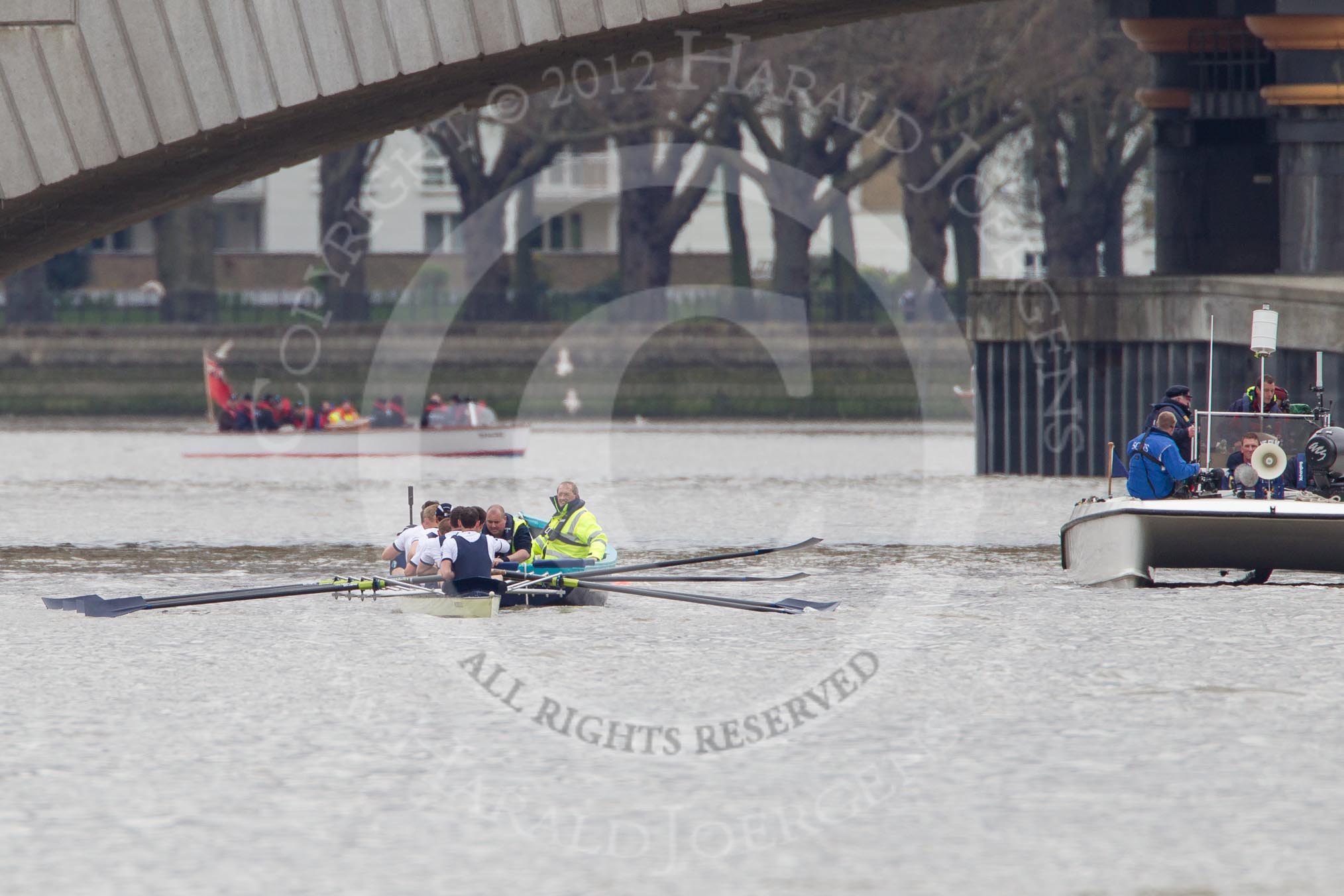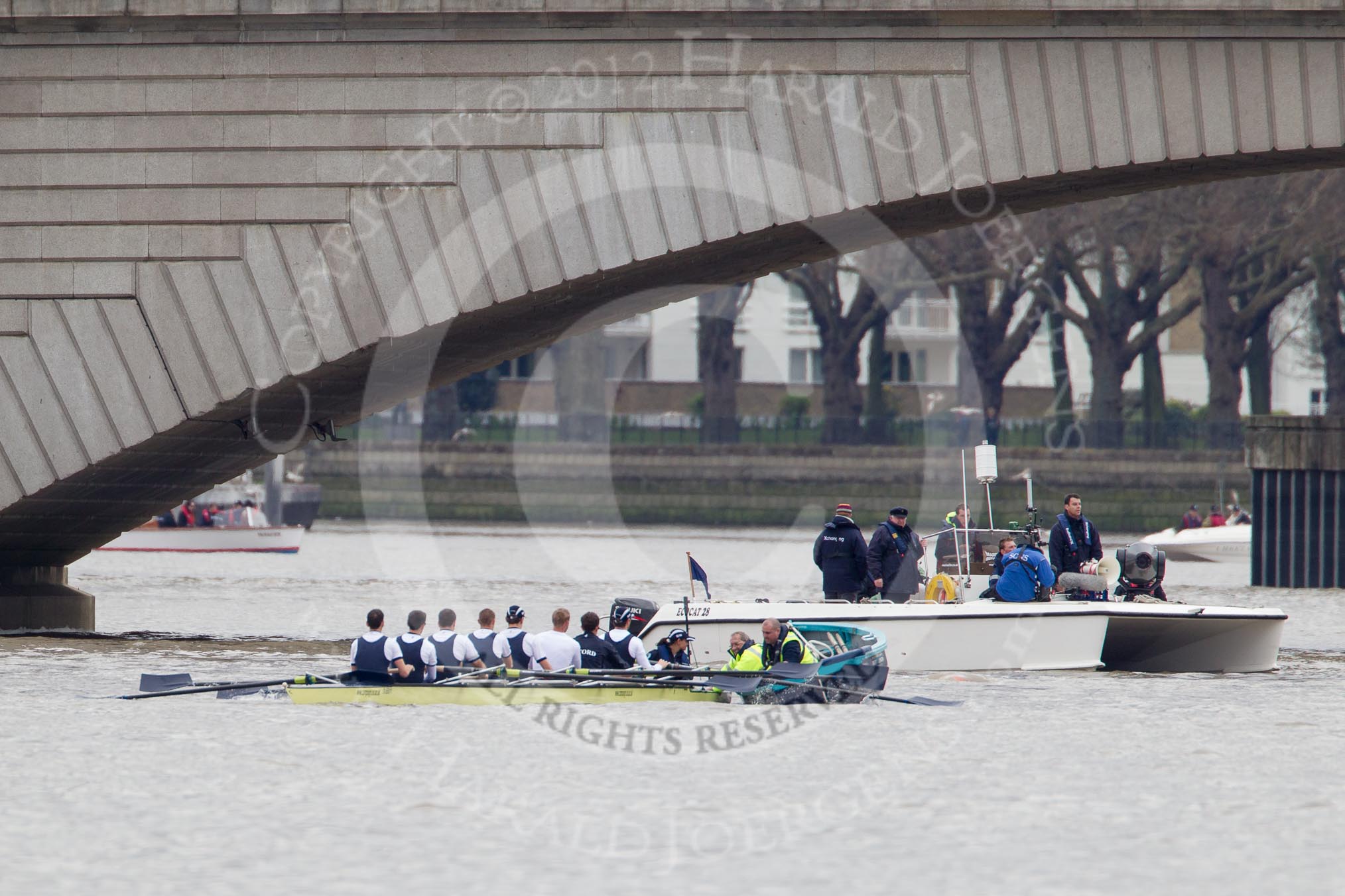 The Boat Race 2012: The Oxford Blue Boat minutes before the start of the 2012 Boat Race, moving below Putney Bridge to the stake boat. Behind umpire John Garret..