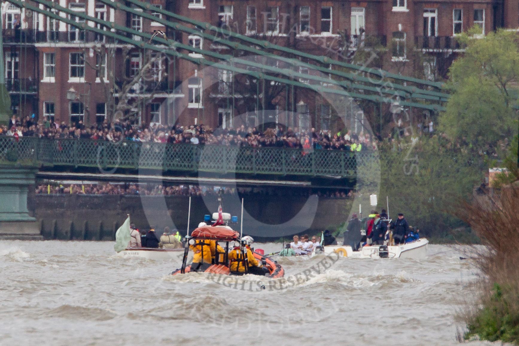 The Boat Race 2012: The 2012 Boat Race, with the boats approaching Hammersmith Bridge: The Cambridge Blue Boat on the left, nearly covered by the boat of the umpire, and the Oxford Blue Boat on the right..