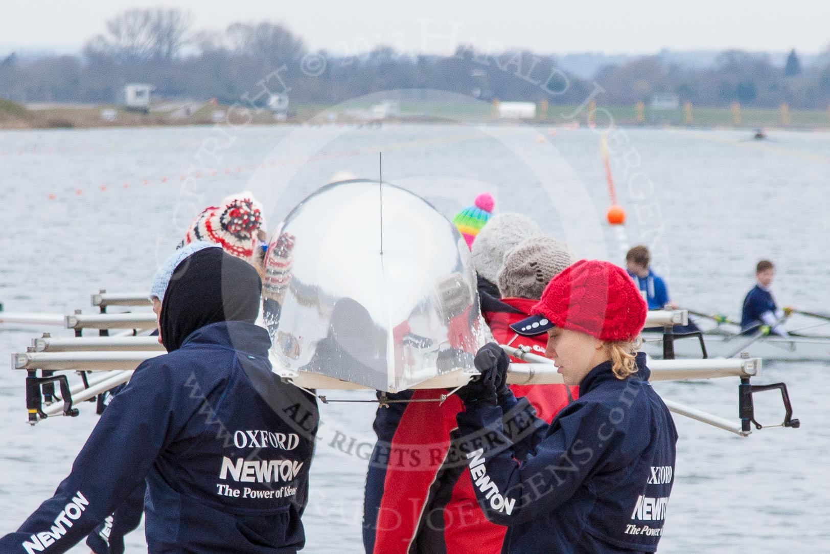 The Boat Race season 2013 - fixture OUWBC vs Molesey BC: Getting ready for the second time on this cold morning - the OUWBC boat with Stroke Maxie Scheske, Anastasia Chitty, Harriet Keane, Amy Varney, Joanna Lee, Mary Foord Weston, Alice Carrington-Windo, Mariann Novak.. Dorney Lake, Dorney, Windsor, Berkshire, United Kingdom, on 24 February 2013 at 11:12, image #21