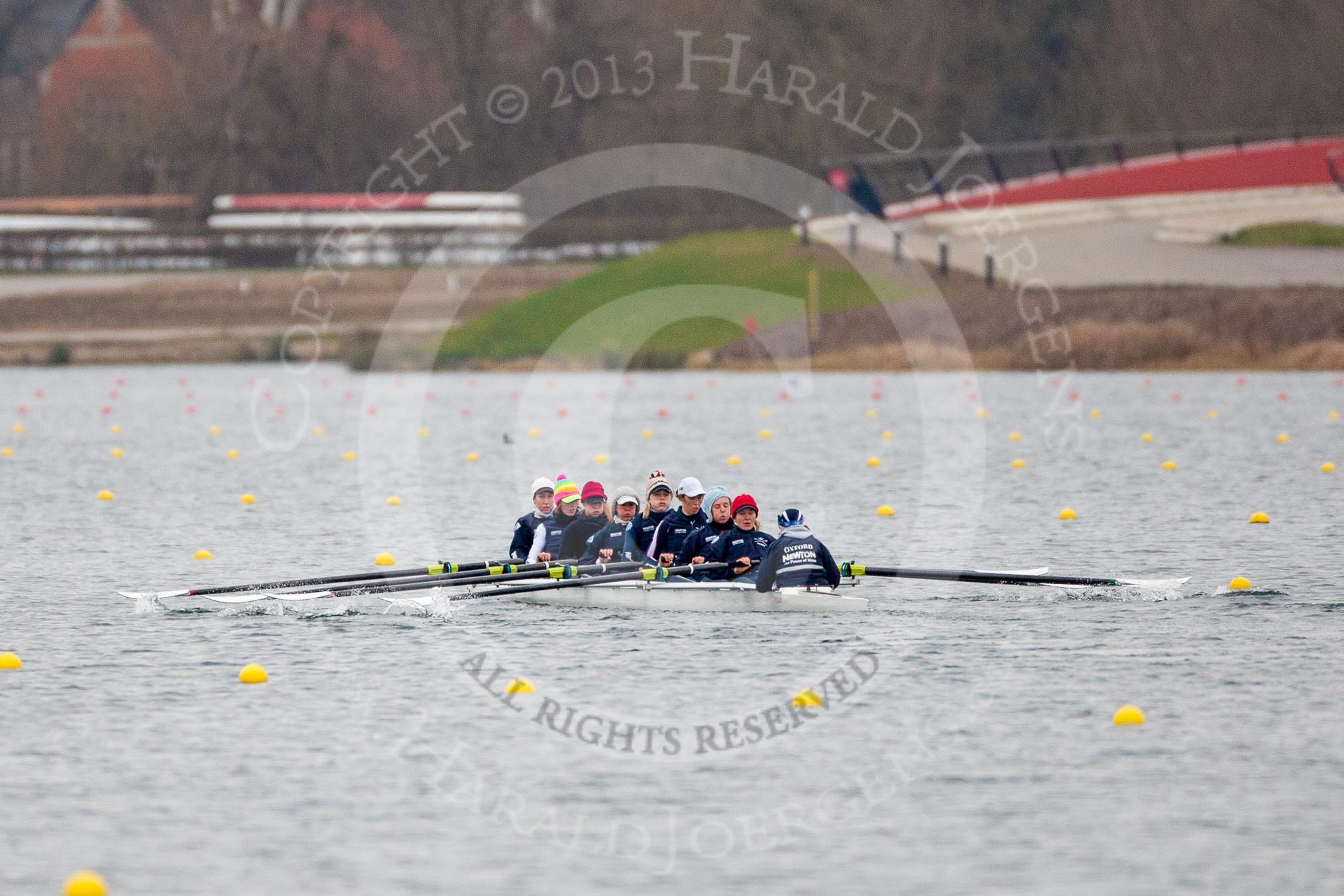 The Boat Race season 2013 - fixture OUWBC vs Molesey BC: The Molesley BC Eight: Three-Olivia Marshall, four-Catie Sharrod, five-Karen Bennett, six-Amelda Gare, seven-Gabby Rodriguez, stroke-Sam Fowler, cox-Helen Arbuthnot.. Dorney Lake, Dorney, Windsor, Berkshire, United Kingdom, on 24 February 2013 at 11:45, image #84