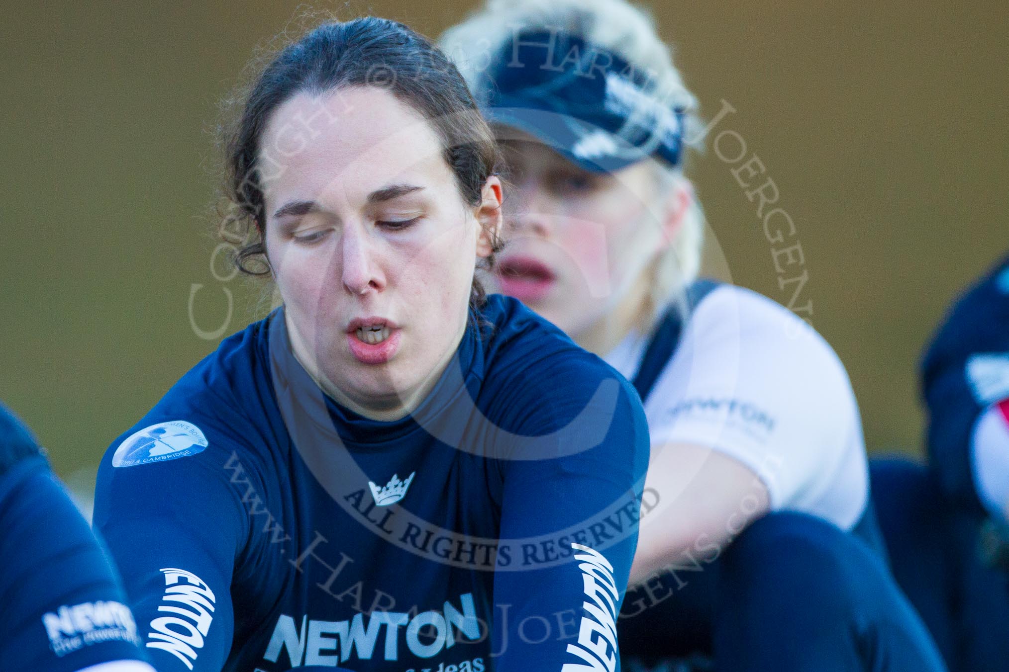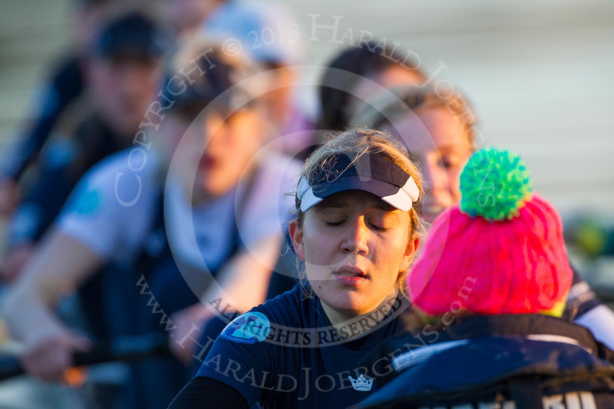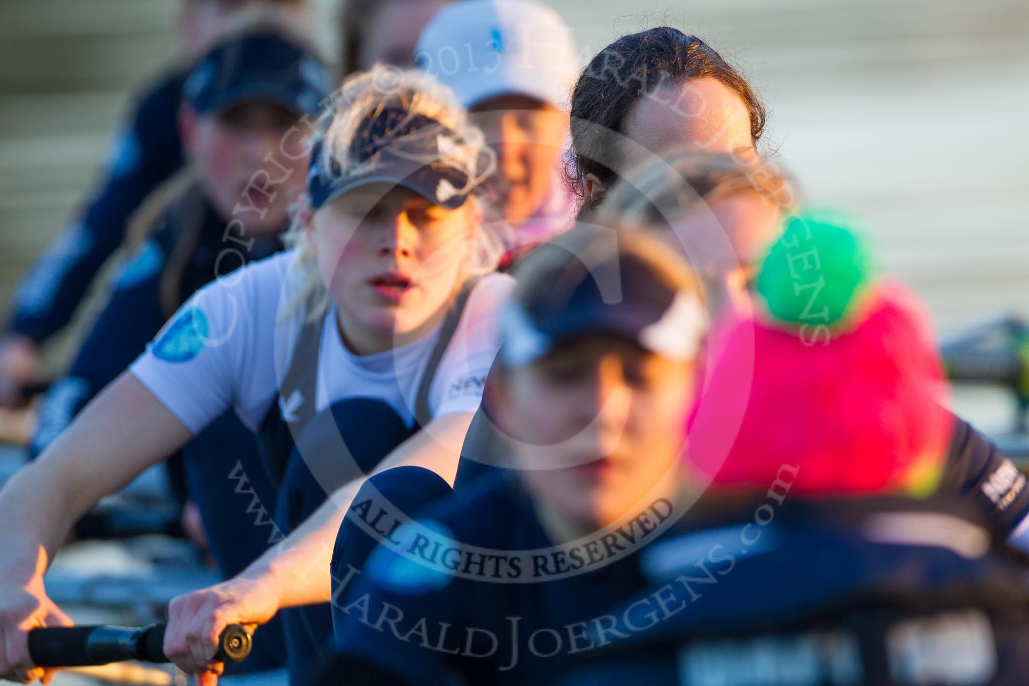 The Boat Race season 2013 - OUWBC training: OUWBC Blue Boat close-up: 5 seat Amy Varney, 4 seat Jo Lee (in focus), and 3 seat Mary Foord-Weston.. River Thames, Wallingford, Oxfordshire, United Kingdom, on 13 March 2013 at 17:31, image #161