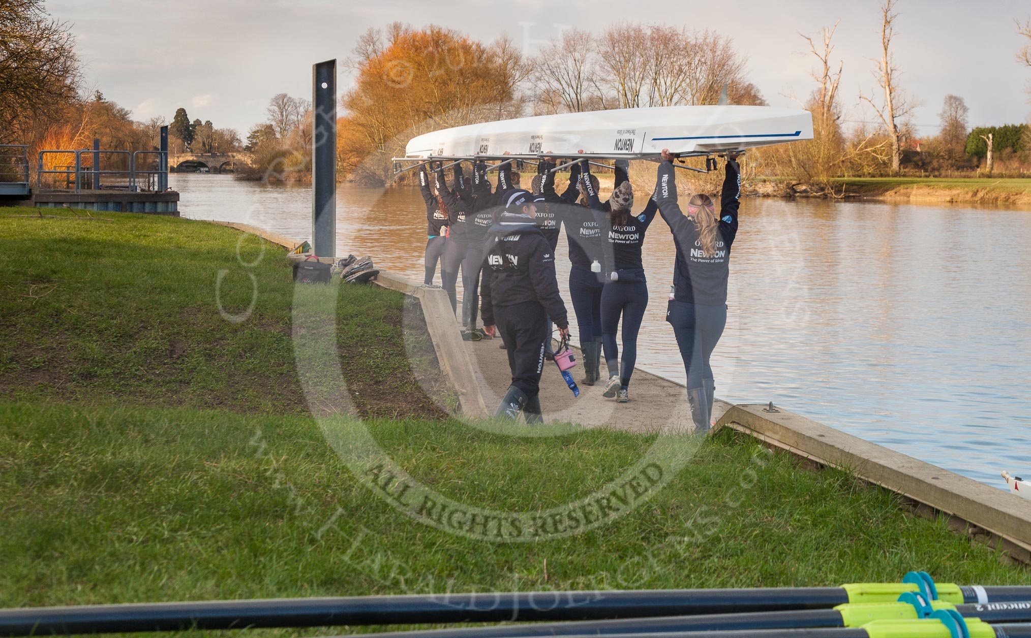 The Boat Race season 2013 - OUWBC training: The crew of the OUWBC reserve boat Osiris getting ready for training at Fleming Boathouse: bow Coralie Viollet-Djelassi, Elspeth Cumber, Hannah Ledbury, Eleanor Darlington, Rachel Purkess, Caitlin Goss, Annika Bruger, stroke Emily Chittock, and cox Sophie Shawdon.. Fleming Boathouse, Wallingford, Oxfordshire, United Kingdom, on 13 March 2013 at 16:50, image #23