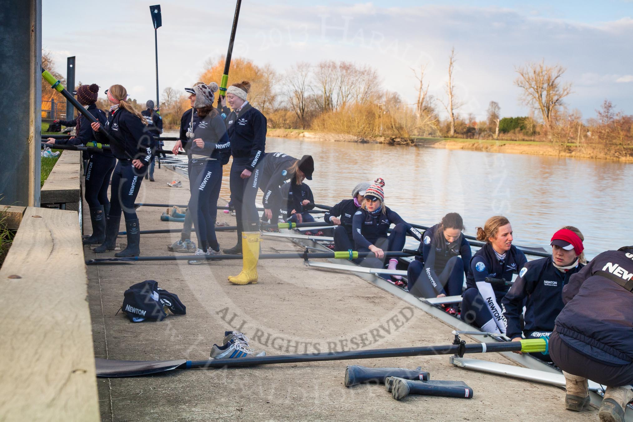 The Boat Race season 2013 - OUWBC training: The OUWBC Blue Boat squad getting ready at Fleming Boathouse - bow Mariann Novak, Alice Carrington-Windo, Mary Foord-Weston, Jo Lee, Amy Varney, Harriet Keane, Anastasia Chitty, stroke Maxie Scheske, and cox Katie Apfelbaum.. Fleming Boathouse, Wallingford, Oxfordshire, United Kingdom, on 13 March 2013 at 16:49, image #18