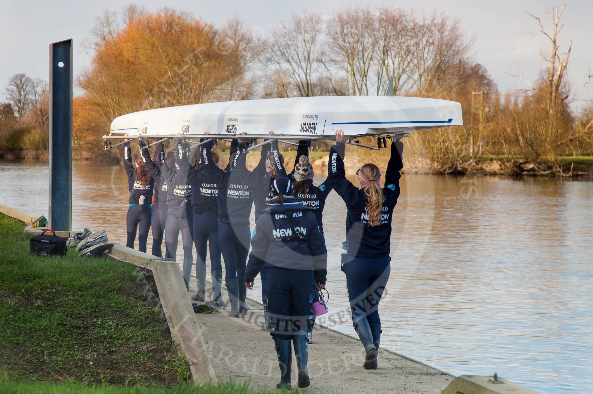 The Boat Race season 2013 - OUWBC training: The crew of the OUWBC reserve boat Osiris getting ready for training at Fleming Boathouse: bow Coralie Viollet-Djelassi, Elspeth Cumber, Hannah Ledbury, Eleanor Darlington, Rachel Purkess, Caitlin Goss, Annika Bruger, stroke Emily Chittock, and cox Sophie Shawdon.. Fleming Boathouse, Wallingford, Oxfordshire, United Kingdom, on 13 March 2013 at 16:50, image #22