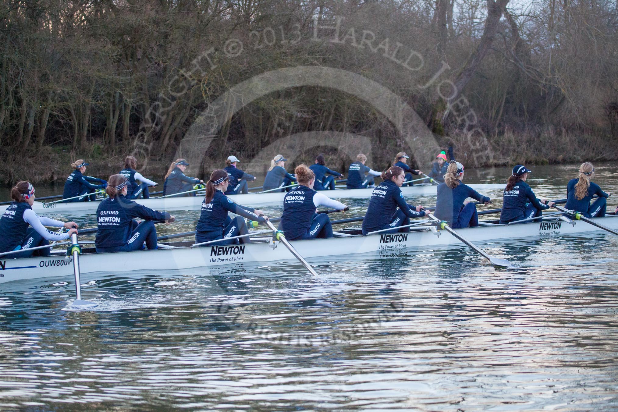 The Boat Race season 2013 - OUWBC training: The OUWBC Blue Boat racing Osiris, the reserve boat: In Osiris bow Coralie Viollet-Djelassi, Elspeth Cumber, Hannah Ledbury, Eleanor Darlington, Rachel Purkess, Caitlin Goss, Annika Bruger, stroke Emily Chittock, in the Blue Boat bow Mariann Novak, Alice Carrington-Windo, Mary Foord-Weston, Jo Lee, Amy Varney, Harriet Keane, Anastasia Chitty, stroke Maxie Scheske, and cox Katie Apfelbaum..
