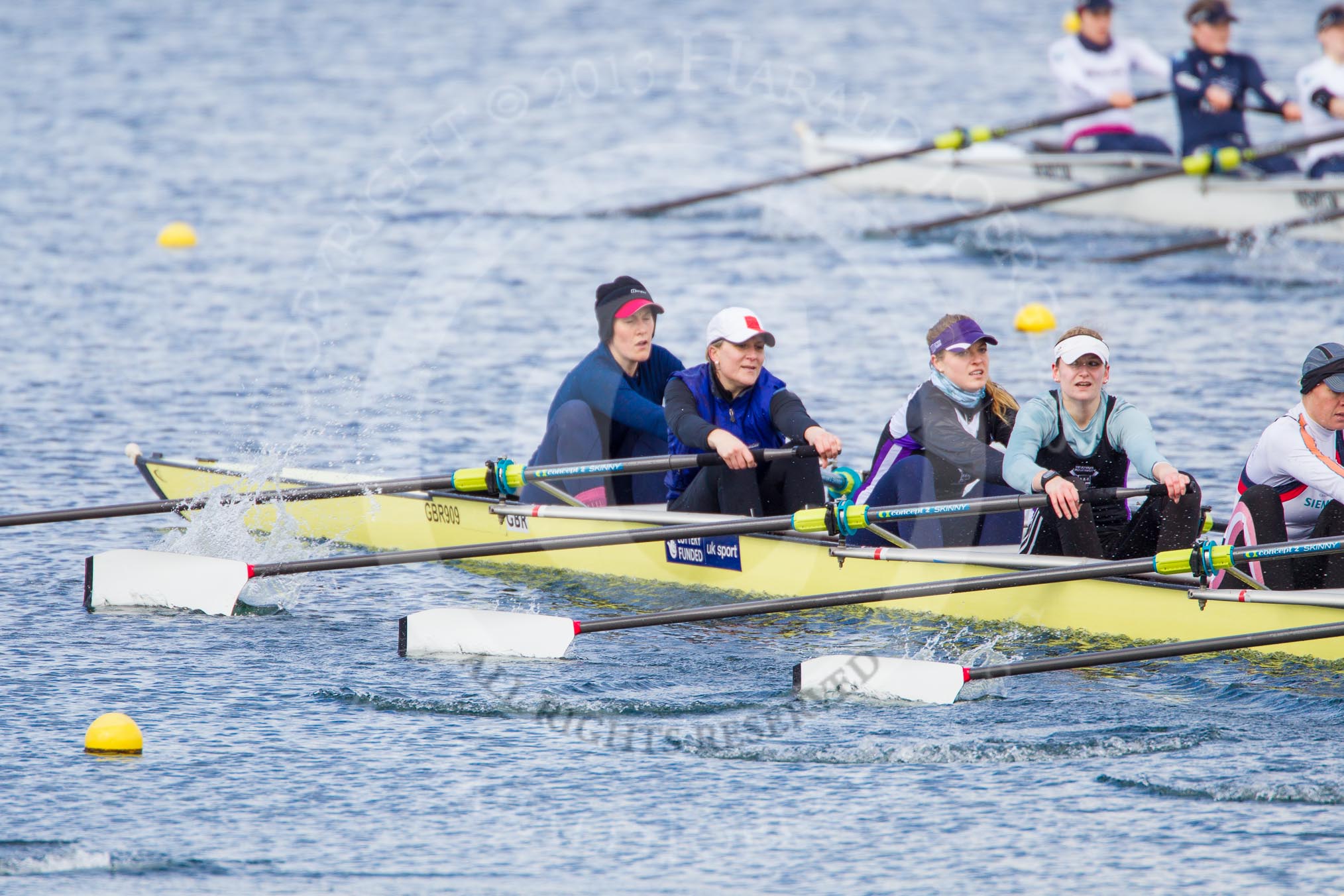 The Boat Race season 2013 - fixture OUWBC vs Olympians: In the Olympians boat at bow Natasha Townsend, 2 Kate Johnson, 3 Christiana Amacker, 4 Bethan Walters and 5 Anna Watkins. In the background the OUWBC reserve boat Osiris.. Dorney Lake, Dorney, Windsor, Buckinghamshire, United Kingdom, on 16 March 2013 at 11:56, image #151