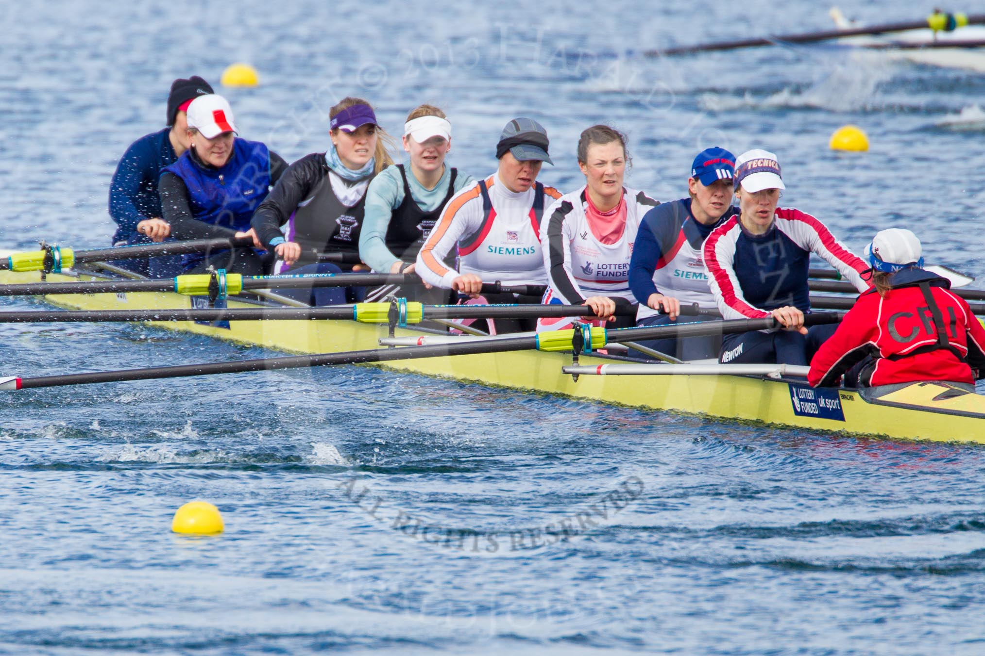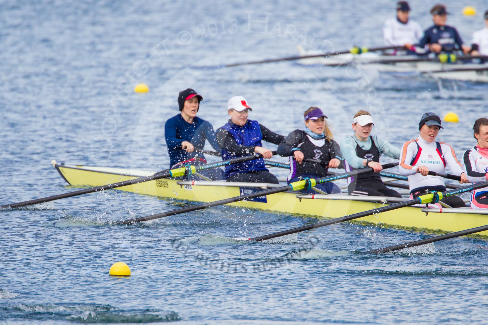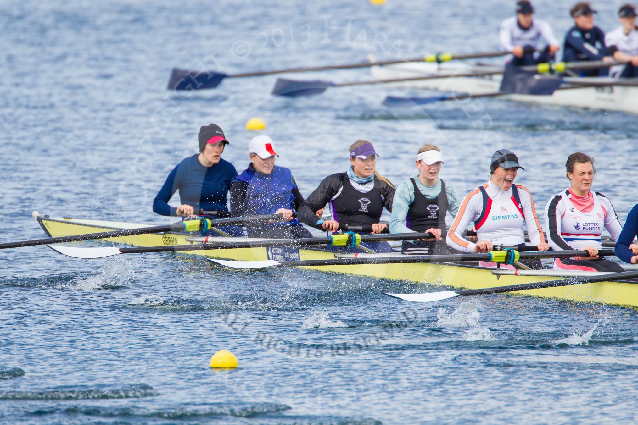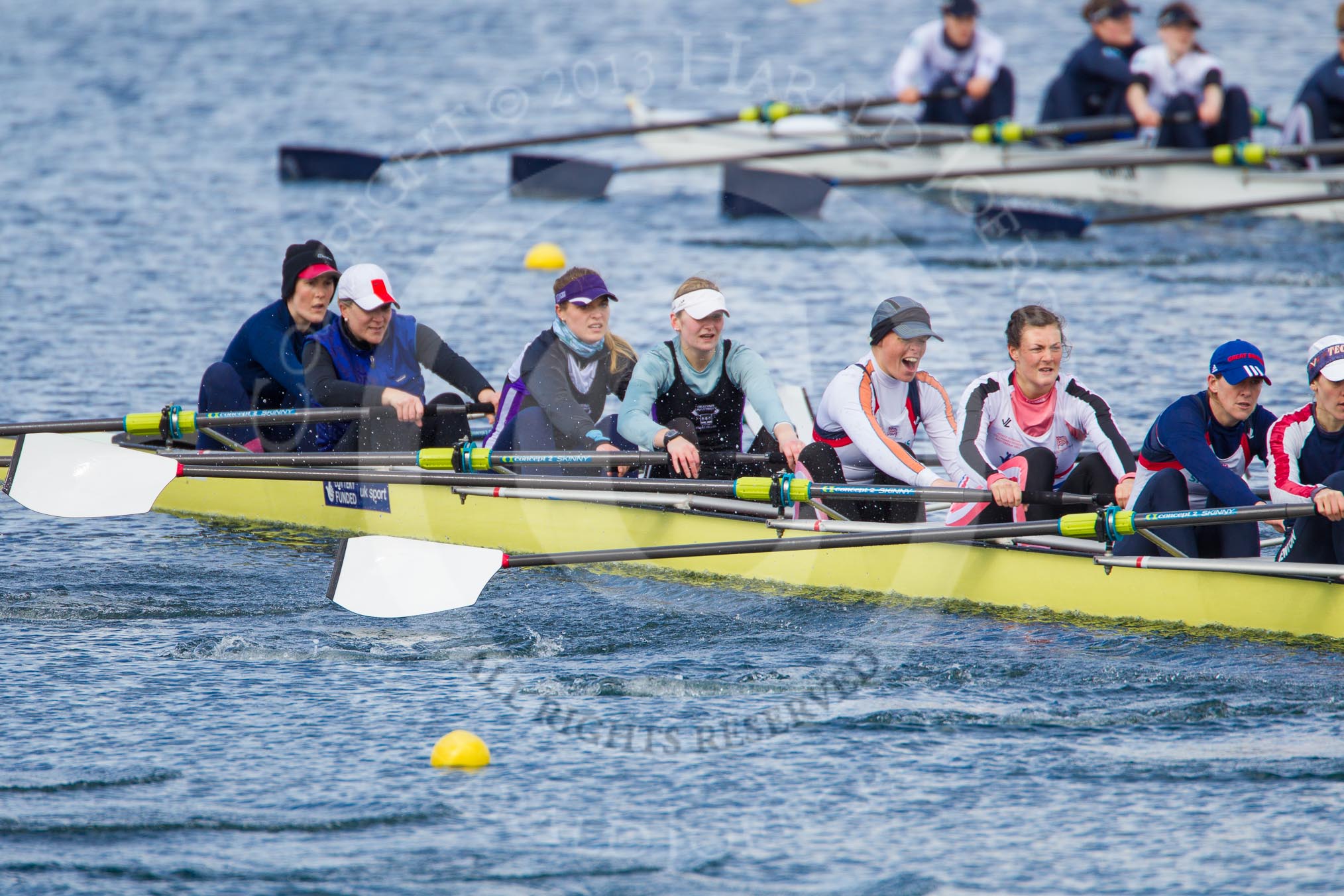 The Boat Race season 2013 - fixture OUWBC vs Olympians: In the Olympians boat at bow Natasha Townsend, 2 Kate Johnson, 3 Christiana Amacker, 4 Bethan Walters, 5 Anna Watkins and 6 Katherine Douglas. In the background the OUWBC reserve boat Osiris.. Dorney Lake, Dorney, Windsor, Buckinghamshire, United Kingdom, on 16 March 2013 at 11:56, image #152