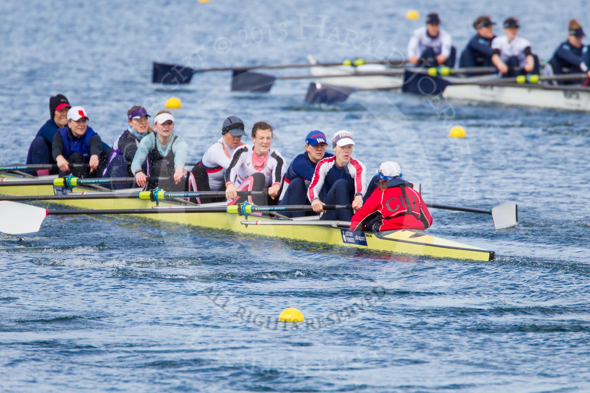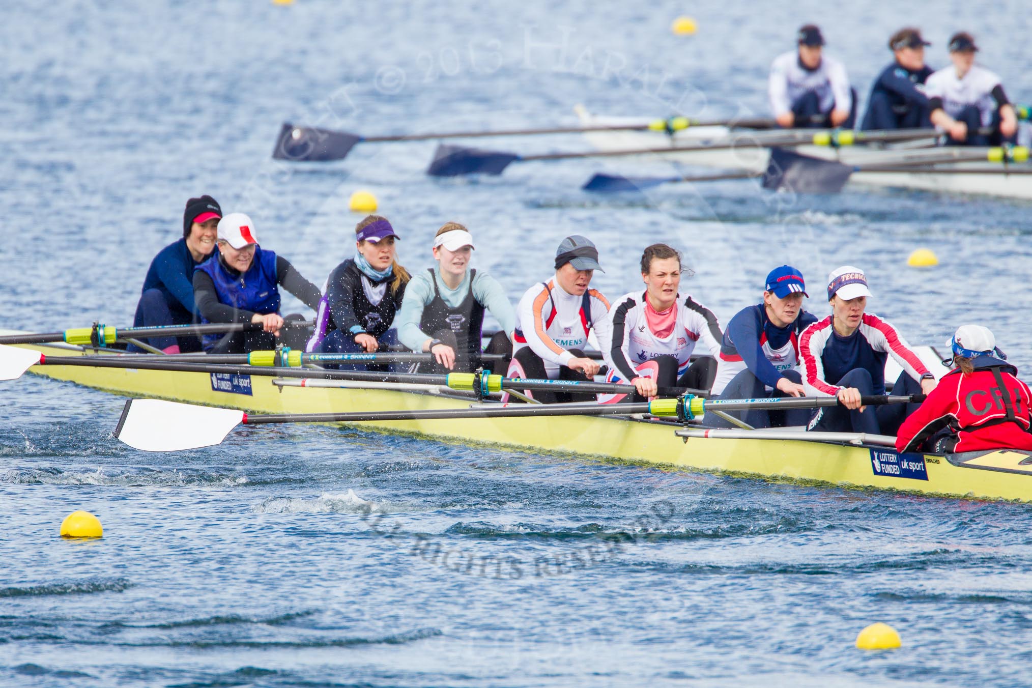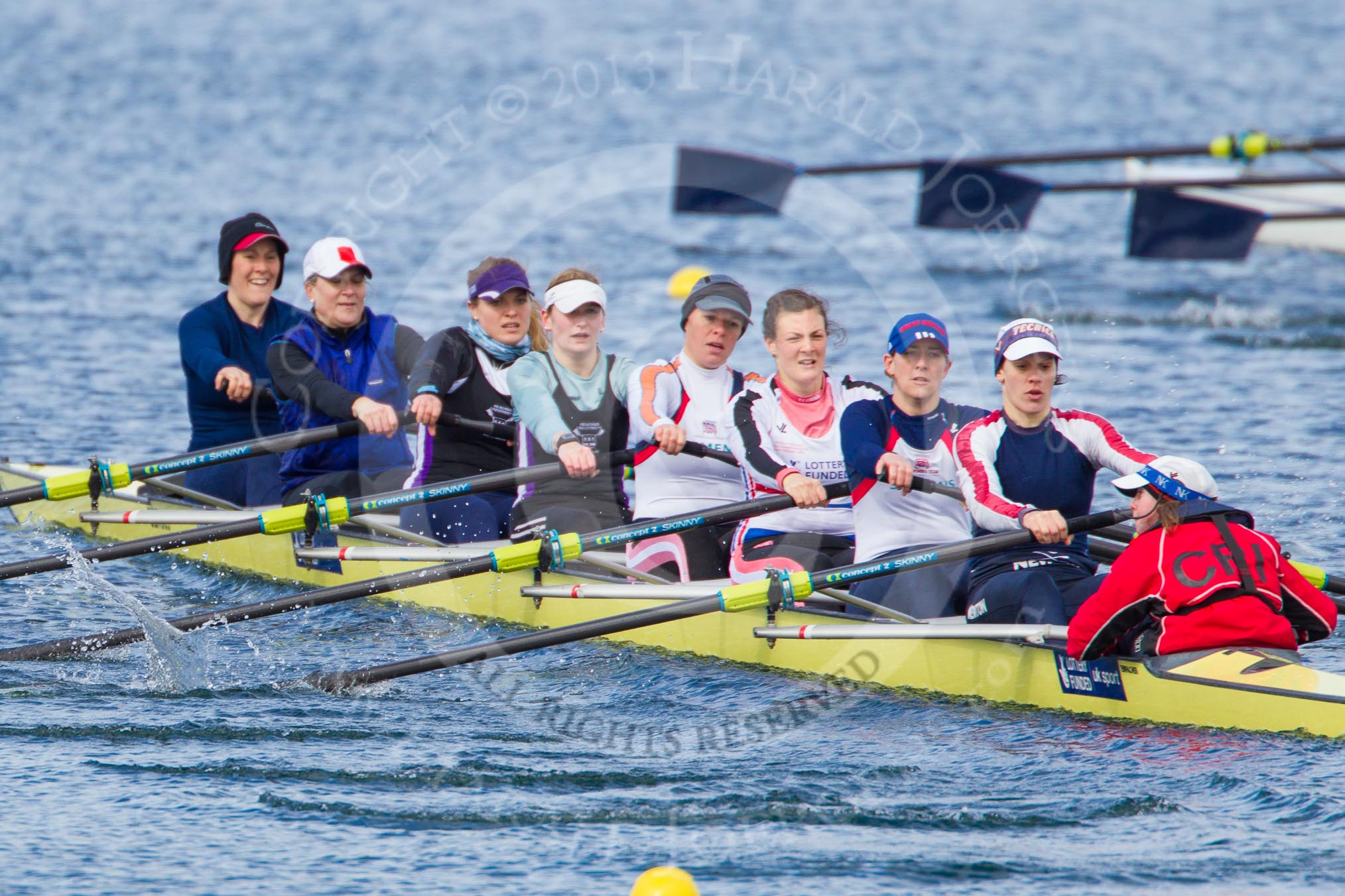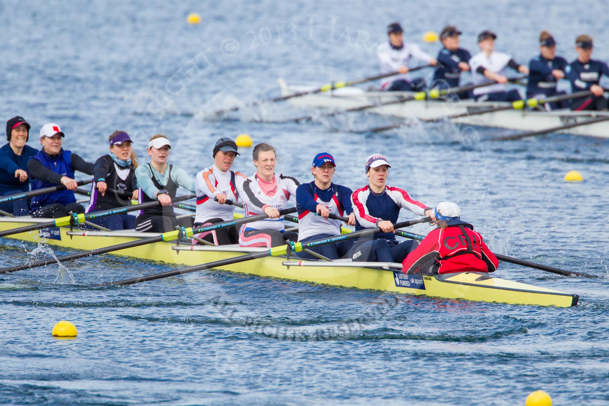 The Boat Race season 2013 - fixture OUWBC vs Olympians: In the Olympians boat at bow Natasha Townsend, 2 Kate Johnson, 3 Christiana Amacker, 4 Bethan Walters, 5 Anna Watkins, 6 Katherine Douglas, 7 Katherine Grainger, stroke Caryn Davies and cox Victoria Stulgis. In the background the OUWBC reserve boat Osiris.. Dorney Lake, Dorney, Windsor, Buckinghamshire, United Kingdom, on 16 March 2013 at 11:56, image #162