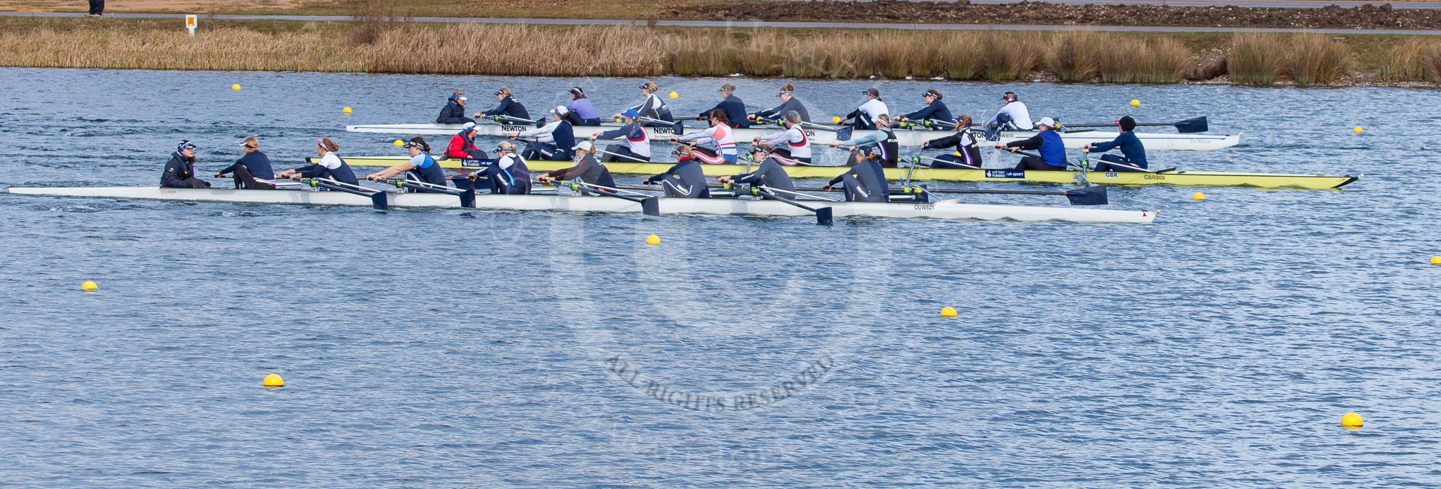 The Boat Race season 2013 - fixture OUWBC vs Olympians: The Olympians, in the yellow boat, racing the two OUWBC boats in a fixture at Dorney Lake. In front the Blue Boat, behind the reserve boat Osiris.. Dorney Lake, Dorney, Windsor, Buckinghamshire, United Kingdom, on 16 March 2013 at 12:17, image #208