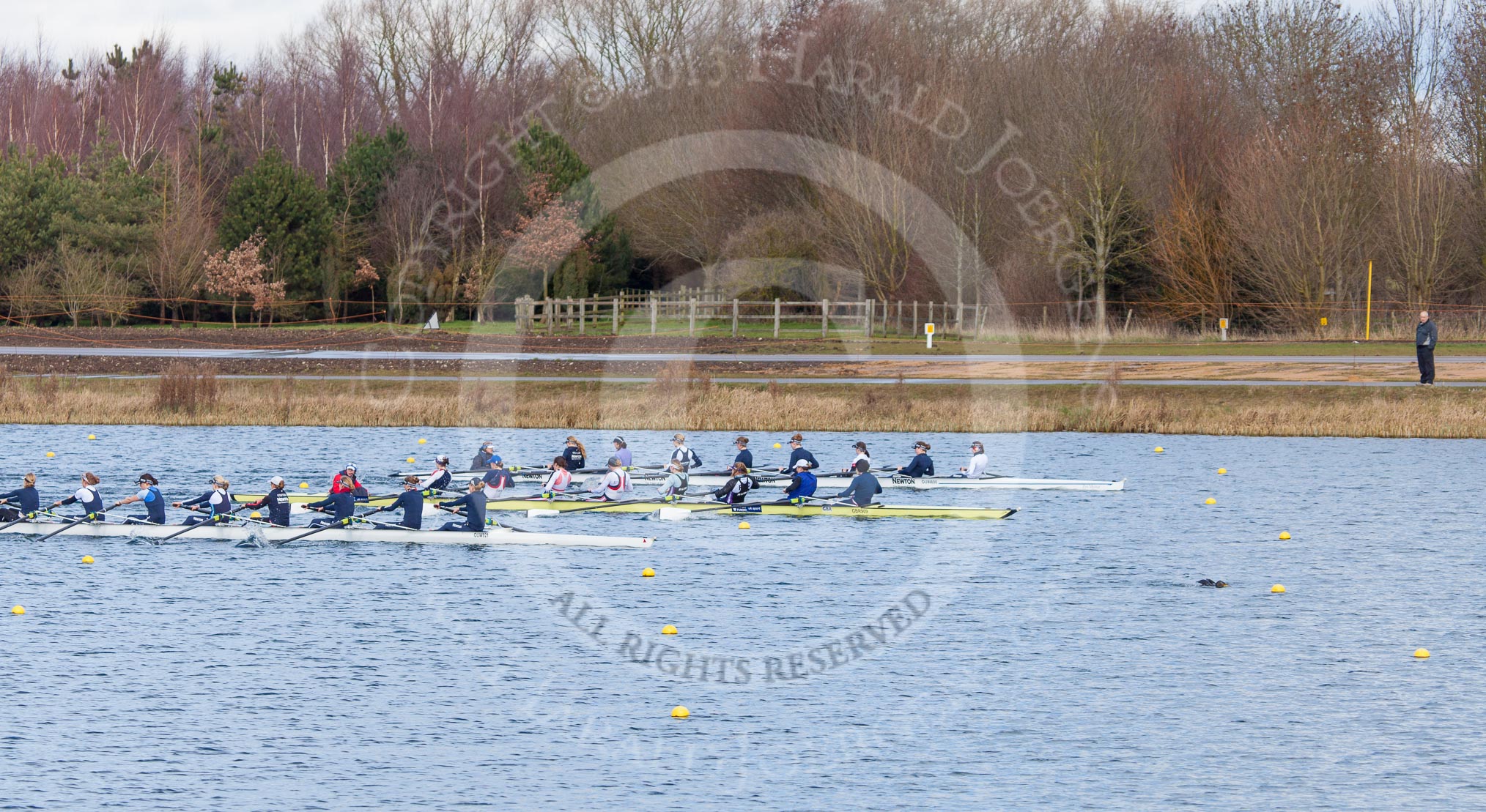 The Boat Race season 2013 - fixture OUWBC vs Olympians: The Olympians, in the yellow boat, racing the two OUWBC boats in a fixture at Dorney Lake. In front the Blue Boat, behind the reserve boat Osiris.. Dorney Lake, Dorney, Windsor, Buckinghamshire, United Kingdom, on 16 March 2013 at 12:17, image #206