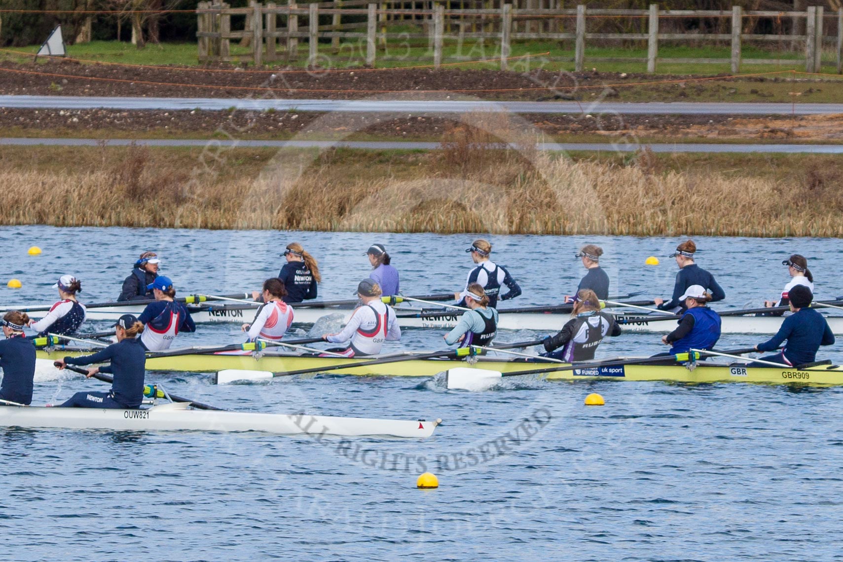 The Boat Race season 2013 - fixture OUWBC vs Olympians: The Olympians, in the yellow boat, racing the two OUWBC boats in a fixture at Dorney Lake. In front the Blue Boat, behind the reserve boat Osiris.. Dorney Lake, Dorney, Windsor, Buckinghamshire, United Kingdom, on 16 March 2013 at 12:16, image #204