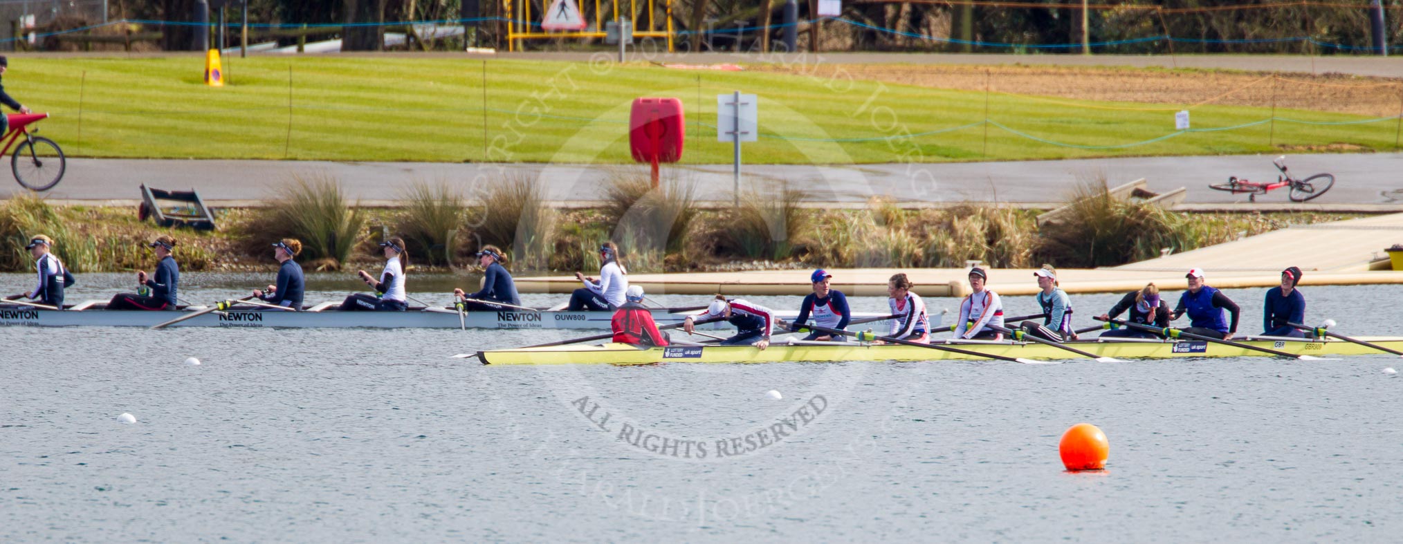 The Boat Race season 2013 - fixture OUWBC vs Olympians: The training session at Dorney Lake is coming to an end with the two OUWBC boats, the Blue Boat in front and the reserve boat Osiris behind and the Olympians boat near the pontoon.. Dorney Lake, Dorney, Windsor, Buckinghamshire, United Kingdom, on 16 March 2013 at 12:21, image #247