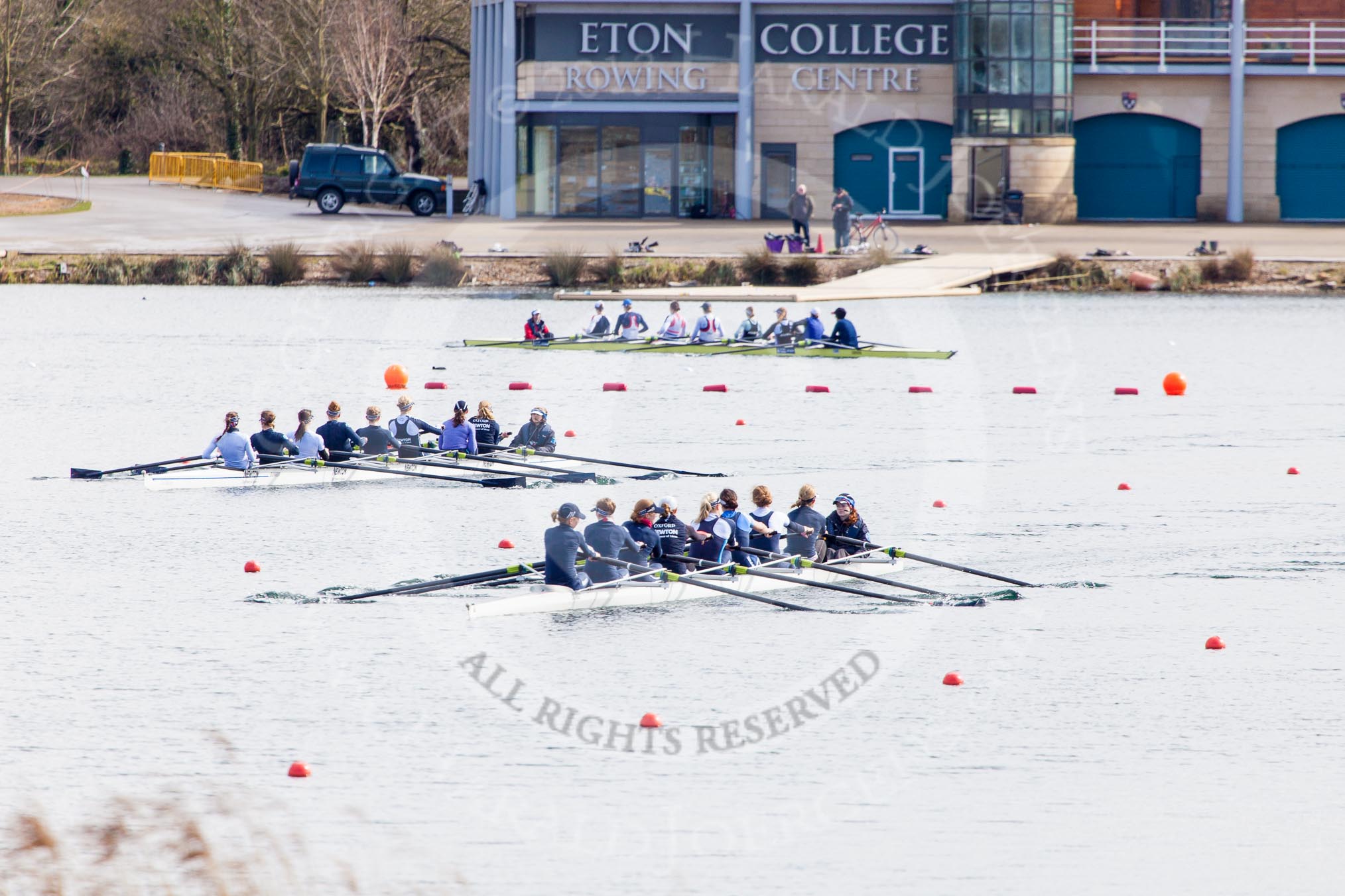 The Boat Race season 2013 - fixture OUWBC vs Olympians: The training session at Dorney Lake is coming to an end with the two OUWBC boats, the Blue Boat in front and the reserve boat Osiris behind and the Olympians boat near the pontoon.. Dorney Lake, Dorney, Windsor, Buckinghamshire, United Kingdom, on 16 March 2013 at 12:21, image #248