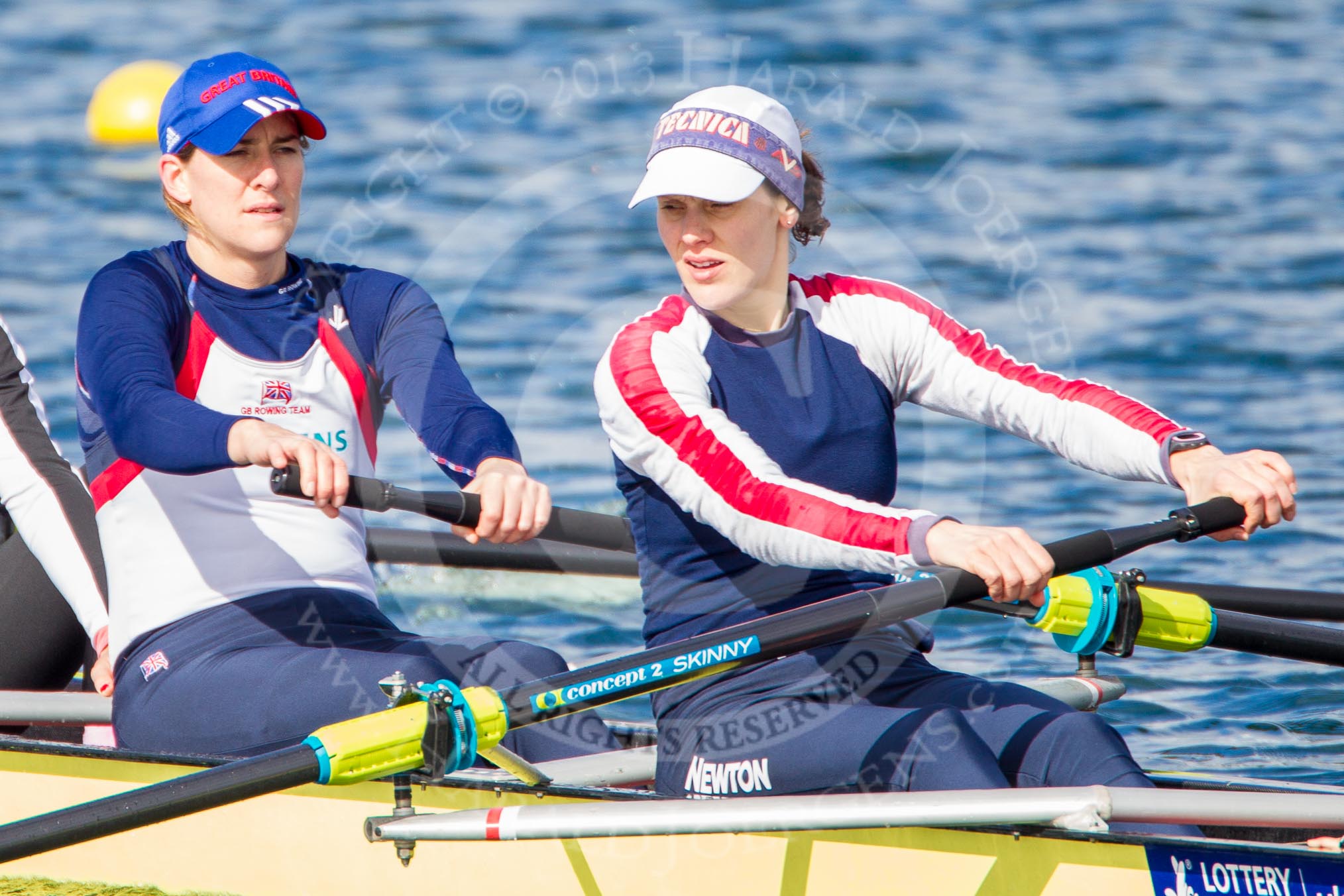 The Boat Race season 2013 - fixture OUWBC vs Olympians: In the Olympians boat 5 seat Anna Watkins and 6 Katherine Douglas. Dorney Lake, Dorney, Windsor, Buckinghamshire, United Kingdom, on 16 March 2013 at 12:23, image #278
