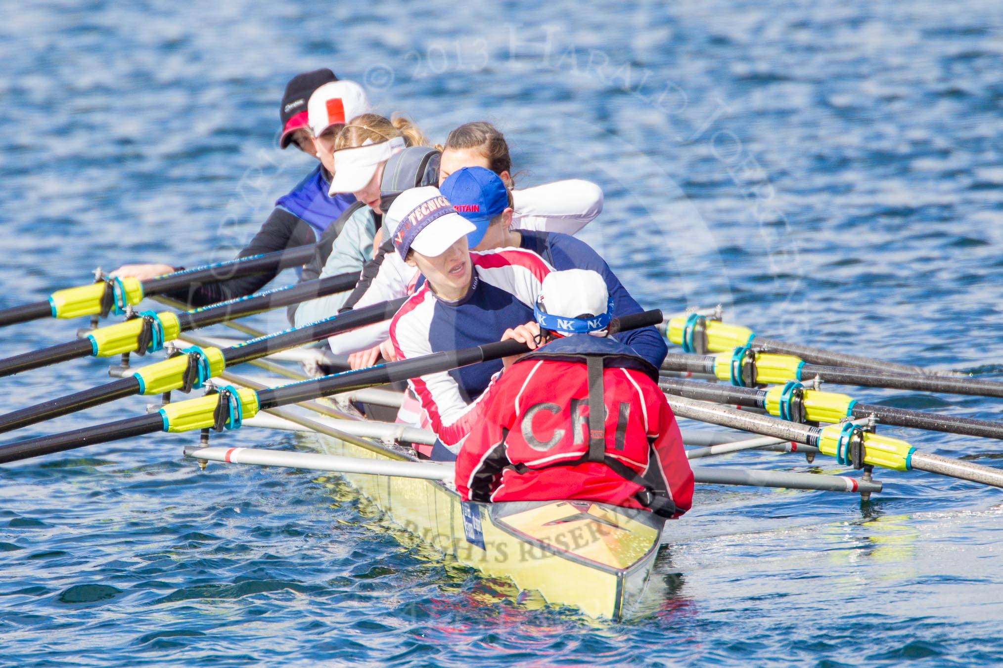 The Boat Race season 2013 - fixture OUWBC vs Olympians: In the Oxford (OUWBC) Blue Boat at bow Mariann Novak, 2 Alice Carrington-Windo, 3 Mary Foord-Weston, 4 Jo Lee, 5 Amy Varney, 6 Harriet Keane, 7 Anastasia Chitty, stroke Maxie Scheske, and cox Katie Apfelbaum.. Dorney Lake, Dorney, Windsor, Buckinghamshire, United Kingdom, on 16 March 2013 at 12:22, image #272
